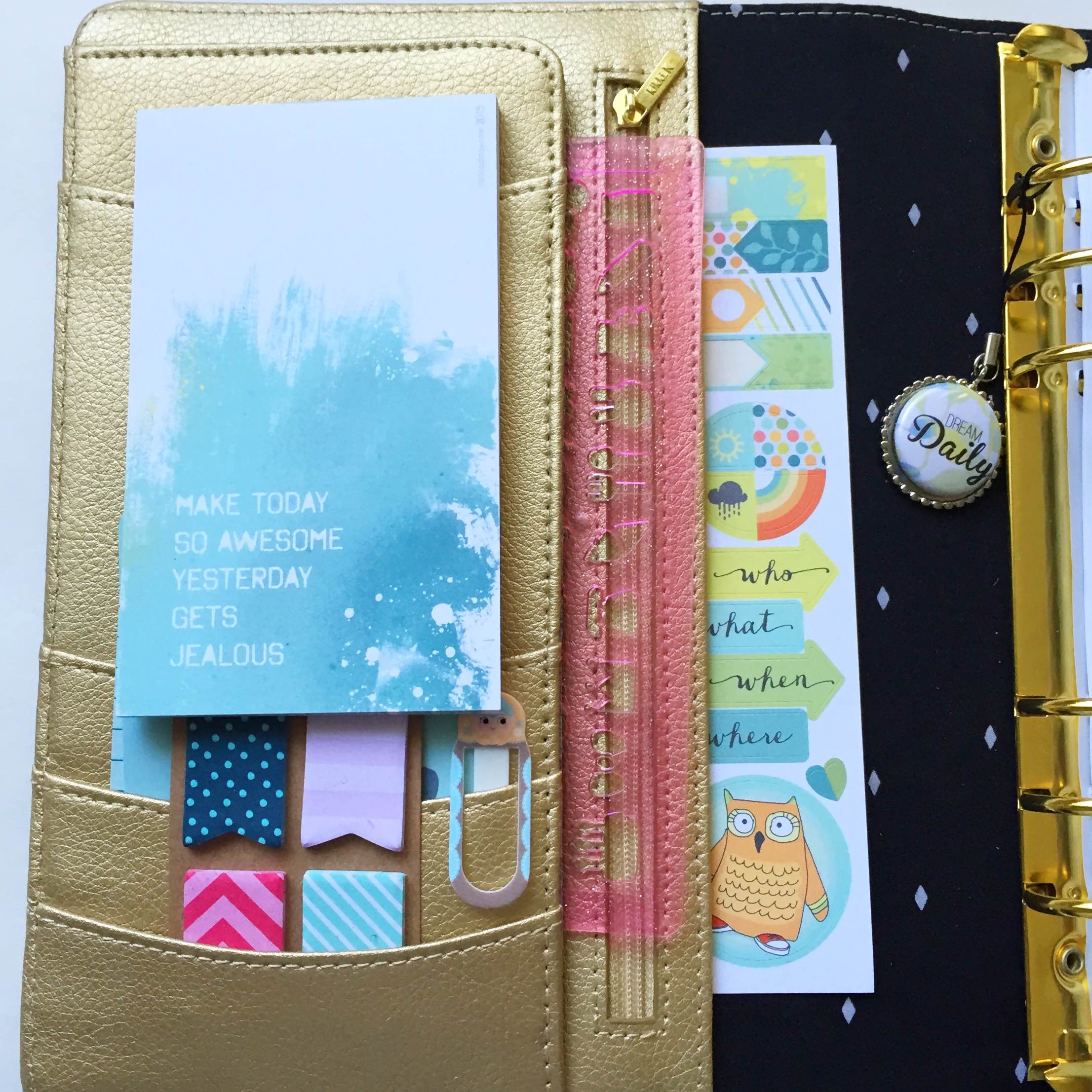 Setting up your planner is a fresh slate. Some people do it once a year, while others like to switch out if they own multiple planners, like myself. My front pocket normally contains some type of notepad, stickies, post-its, and paper clips. These are the easy accessible items. I also added a pink stencil and the March stickers in front.