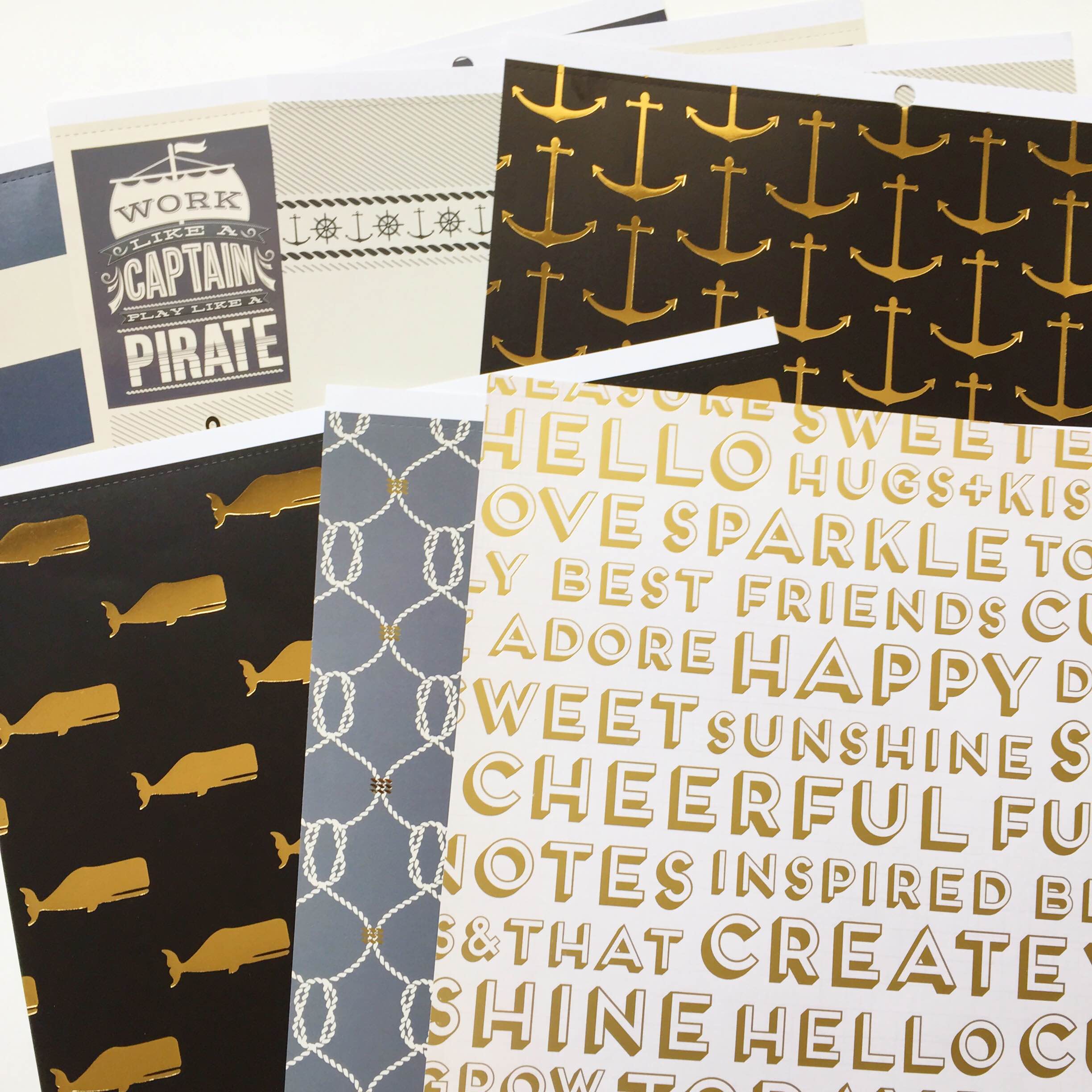 I wanted to make my own dividers and chose a few blues, blacks, and golds to go with the nautical theme. I also utilized the Crate Paper Craft Market 12×12 that can be purchased through an add-on with the paper kits (which are amazing as well!)