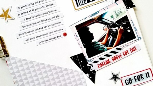 and last, mine. I chose to adapt the sketch to a travelers journal layout. My goodness, my son is driving! :
