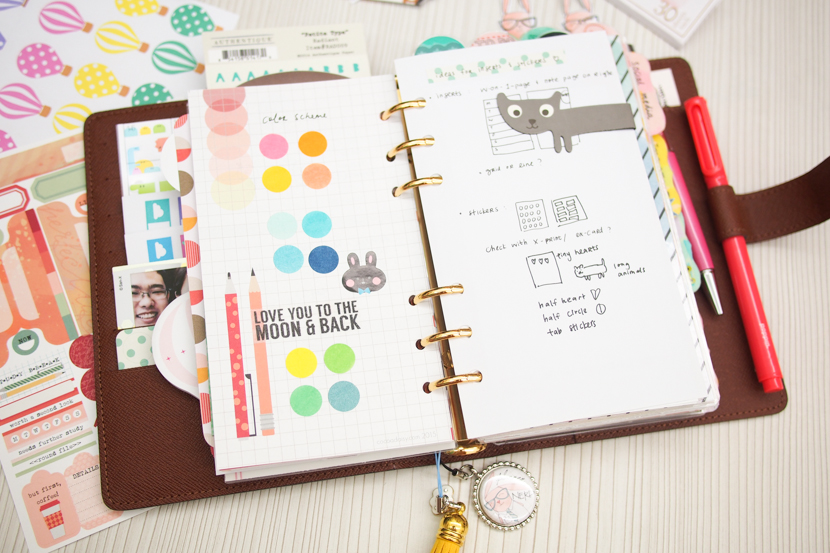 Back of the week-on-2 page pages: I use to record the colour combination that I want to use in my June planner kit. I colour the circle dot stickers with copic markers and stuck them down. I can easily refer to the colour combination when I work on the kit. And the right page is just white paper sheet that I use to doodle / illustrate the design for my future kits.