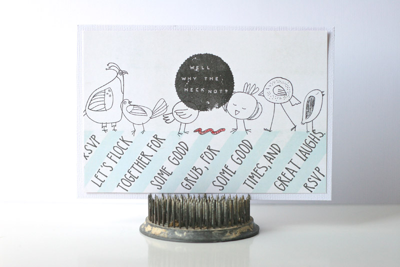 Here I have used a 4×6 DITL card for the base of my design and stamped several of the adorable little birdies along the “horizon line” of the card. I used the negative space of the diagonal striped pattern to place my sentiment.