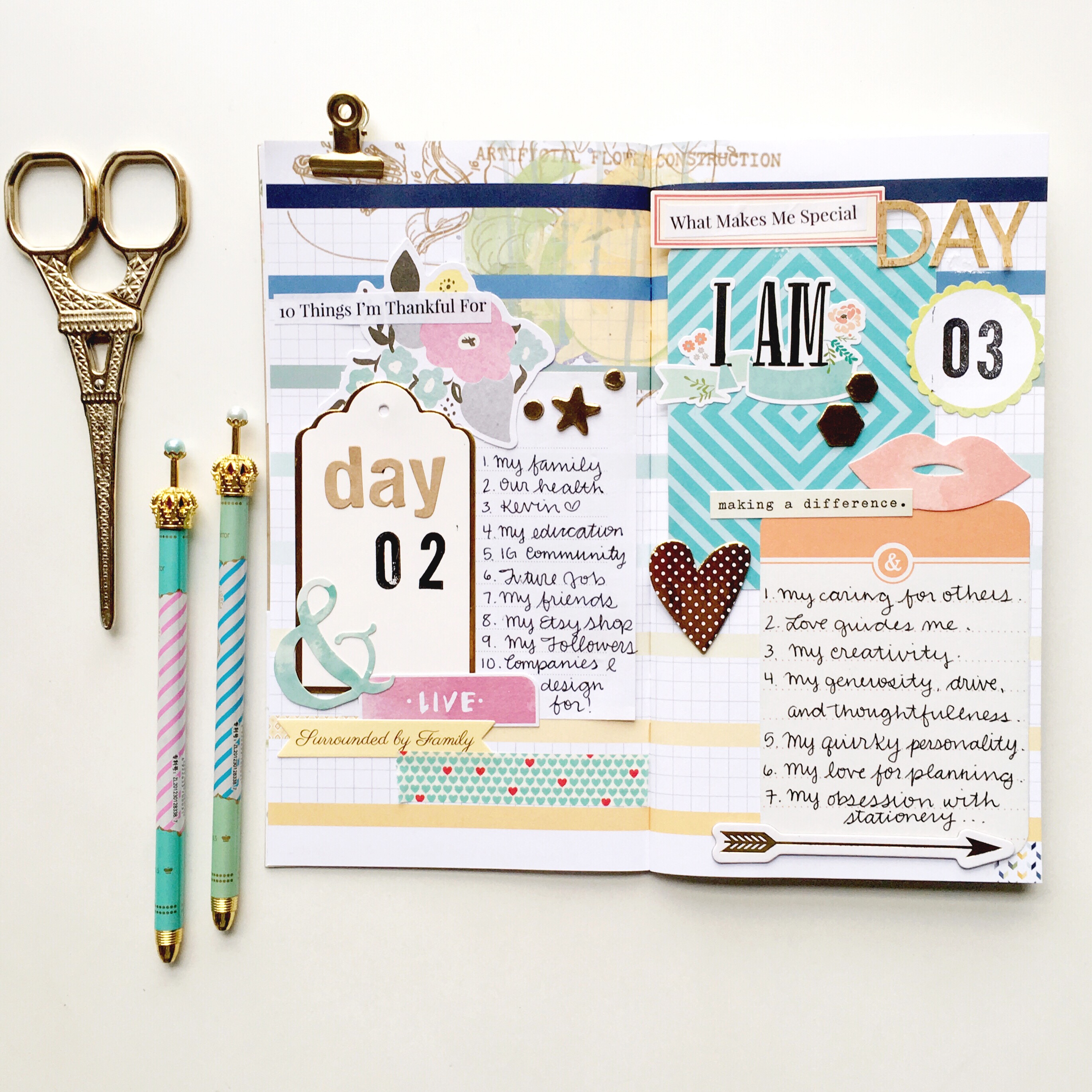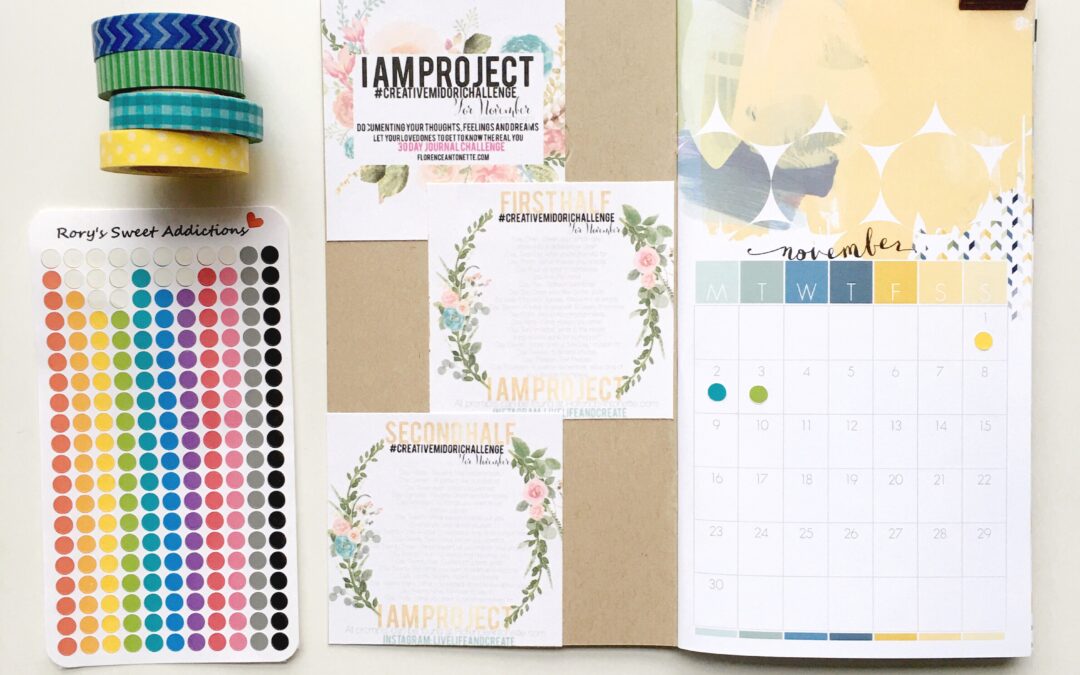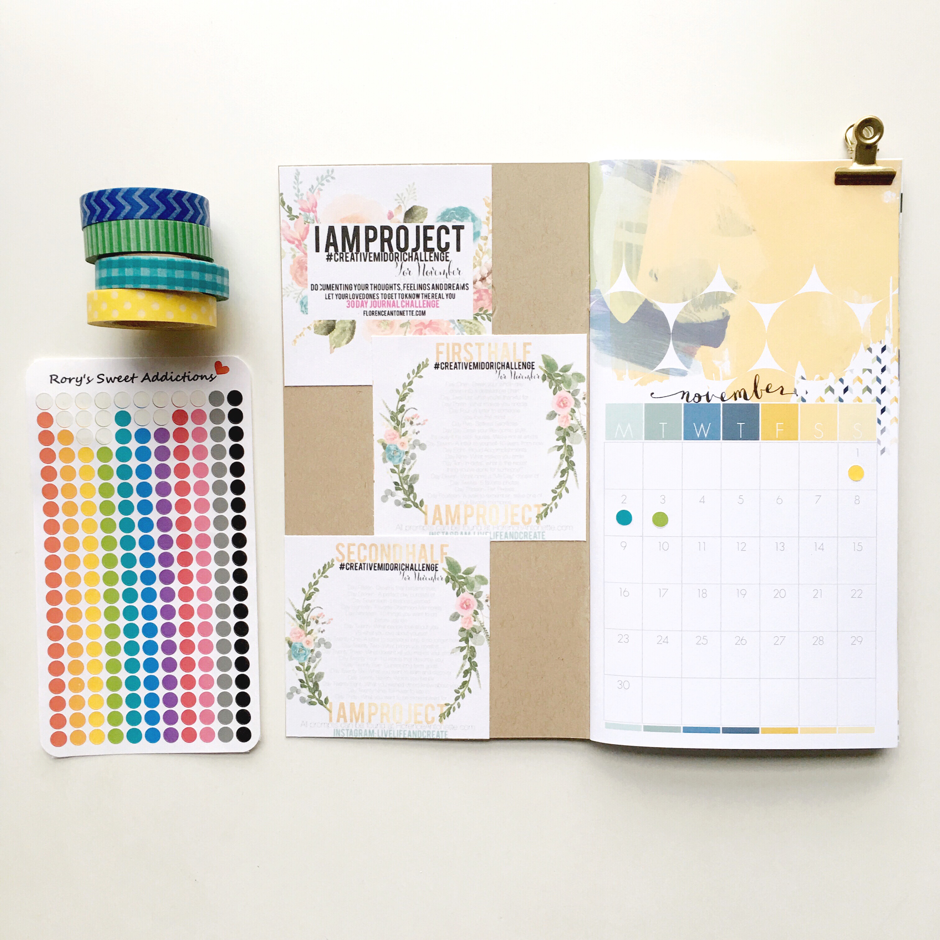I printed out the prompts of the #creativemidorichallenge and pasted them into the inside cover of my Daisy Dori. I’m also using mini circle dots from roryssweetaddictions to mark the days that I complete: