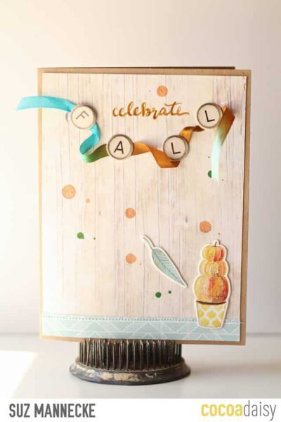 Suz is next with two lovely cards. I love how she “strung” the Fall on the ribbon and gave the sense of the feather floating down.