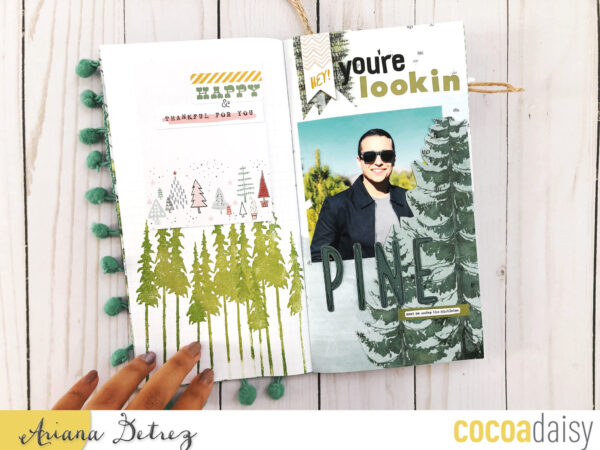 “Hey! You’re lookin PINE”: This title was absolutely perfect for a photo of my husband at a Christmas tree farm! I decided to cover the layout with trees to really emphasize the pun. I might have went overboard. The process video for this layout can be found here. I fussy cut the pine tree on the right from one of 6×6 papers.