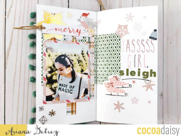 “Yass Girl, SLEIGH”: To watch the process video of this layout click here. This photo was taken at the Holloways Christmas Tree farm where we literally went just to take photos. We ended up just getting a fake Christmas tree. A lot fo the die cuts used in this layout are from Crate Paper which were in the Christmas bonus kit.