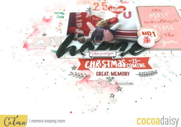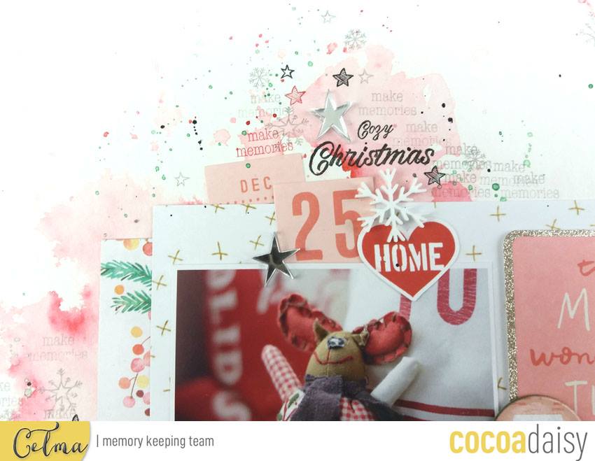 I love the subtle, messy stamping of words and tiny images at the top of the page, and the title, “Cozy Christmas” is perfect in that old-fashioned script. Show us what you’re doing with your Snow Globe stamps by hashtagging your projects on social media #cocoadaisy !