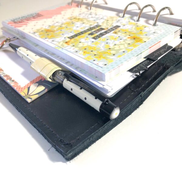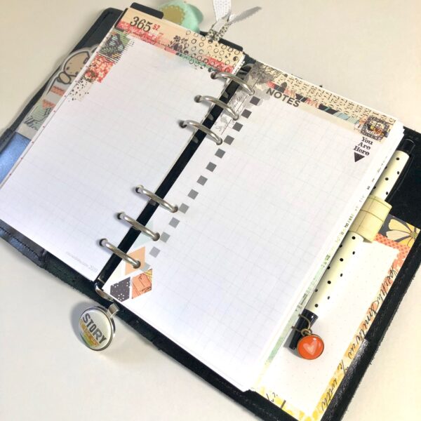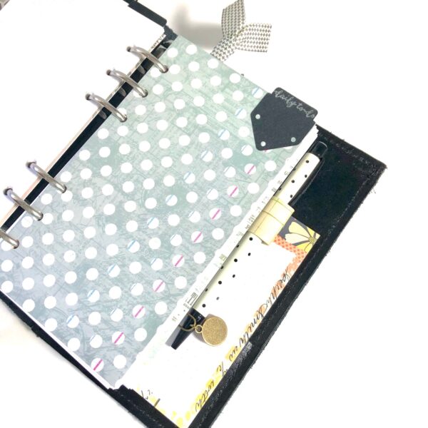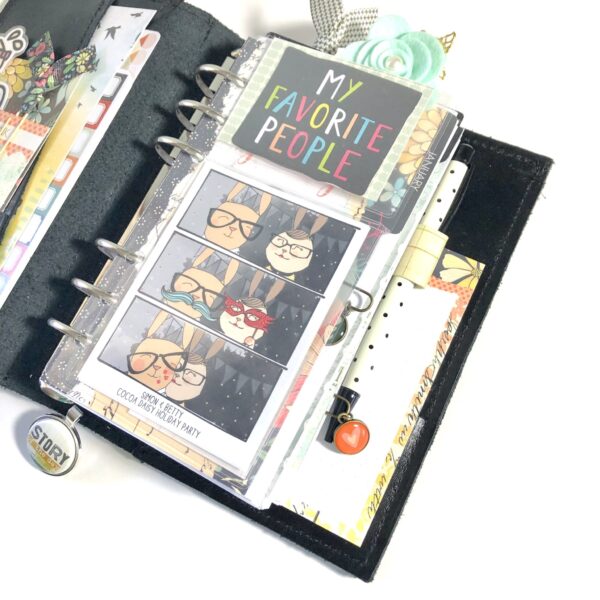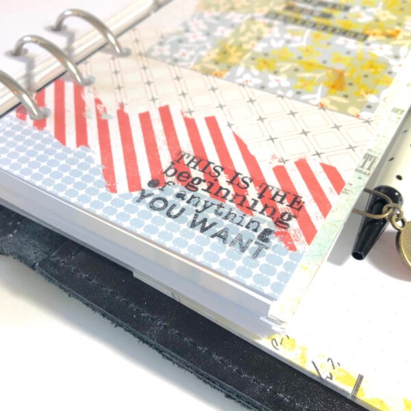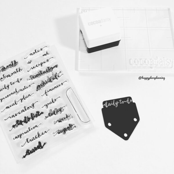 One of the first things I do when I’m setting up my planner for the month is to make dividers for each of my sections. This month, Christine included some vintage inspired black tags. I knew as soon as I saw them I’d be putting the traditional tabs (that come in the main planner kit each month) aside and using them instead. I also mixed things up a bit and made a set of top tabs rather than side tabs. I used the silver ink pad from the planner add on kit and an older stamp set to create a label on each tab.