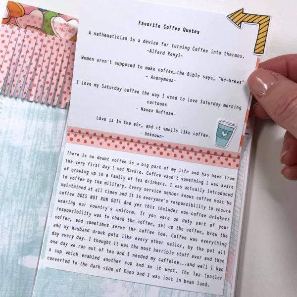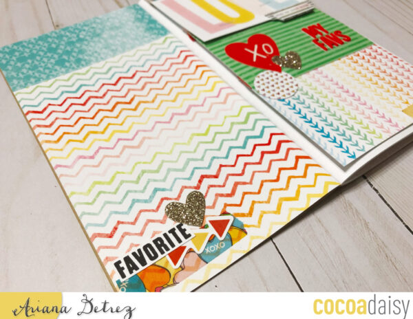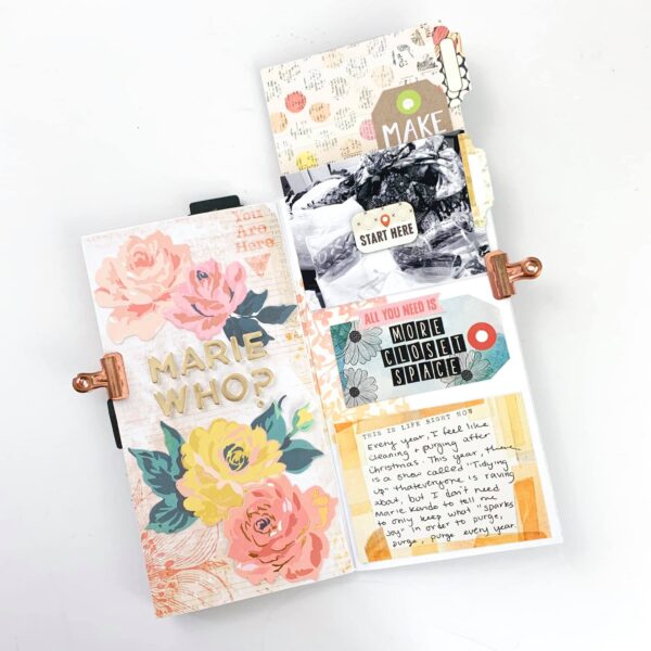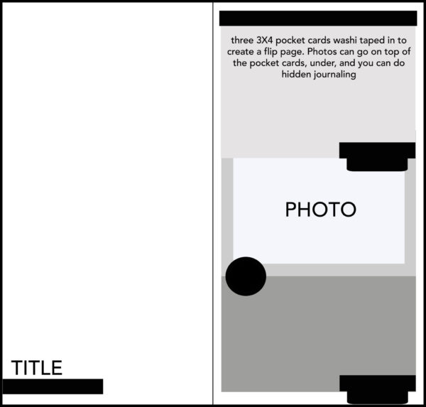 The whole idea is to be able to incorporate multiple photos on a layout. The right side are three 3″x4″ pocket cards washi taped in to create a flip page. You can add photos, hidden journaling, or just use it as a decorative element.