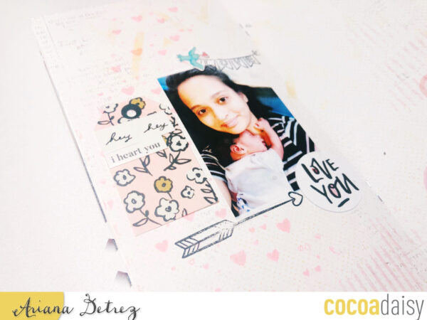 I used the heart stamp to create a soft repeated background. With the simple dori, it is so easy to just paste a photo down and call it a day. To add some interest to your background, you can create a repeated background with the stamp and ink color of your choice. I usually like to pick a color that blends well so that the background isn’t too distracting. I then used black ink to stamp the love banner and arrow. From there, I embellished away.