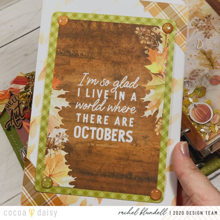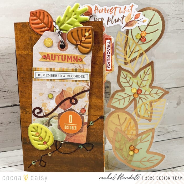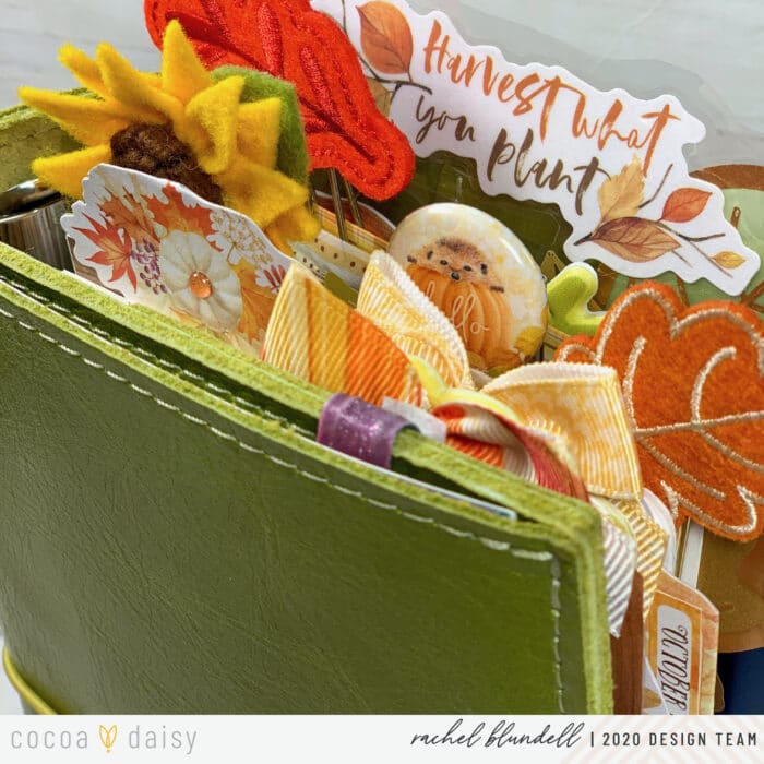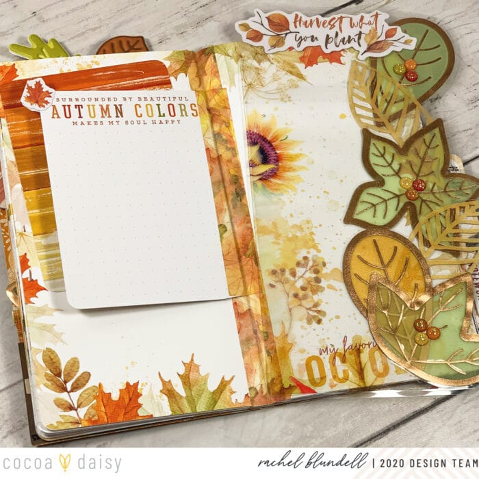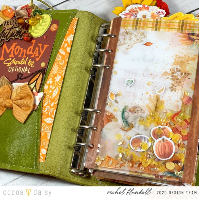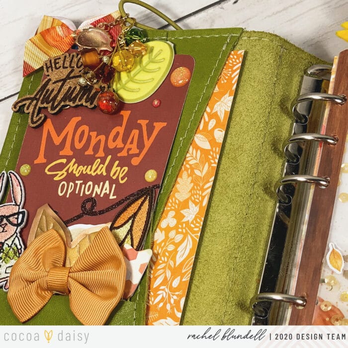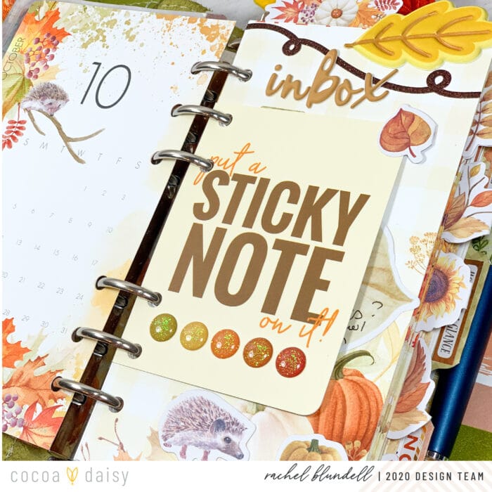 As ever, the #cocoadaisysnark is strong this month, and having this pocket card up front makes me smile whenever I open my planner. I pulled a few things from last year’s kits as well – the ‘Hello Autumn’ cork element being one of them.