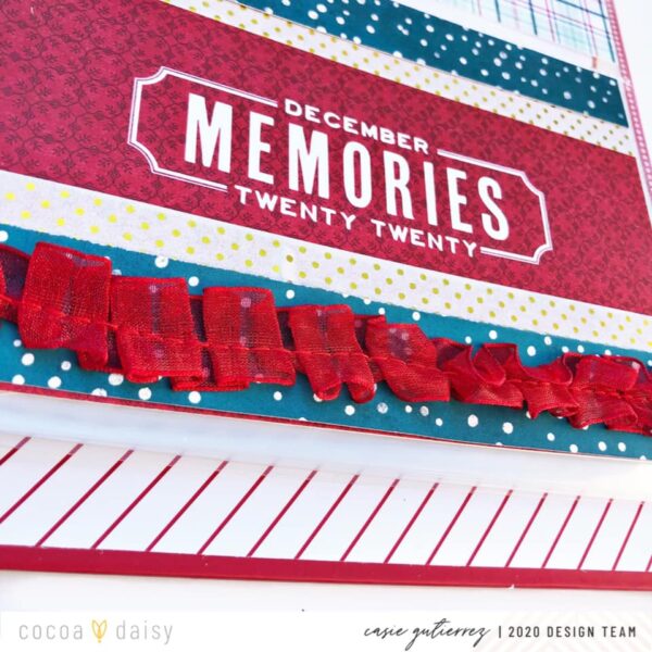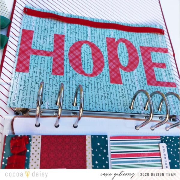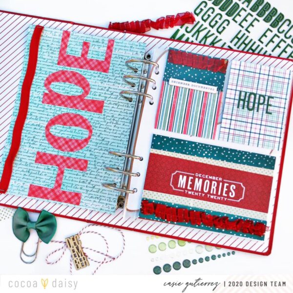 I finished the design using the word HOPE. I chose this as my word for my December album because I want to finish out the year 2020 with a little hope!” We love how Casie paired a bold title with delicate embellished layers on the pocket cars. This makes such a beautiful introduction to her December album.