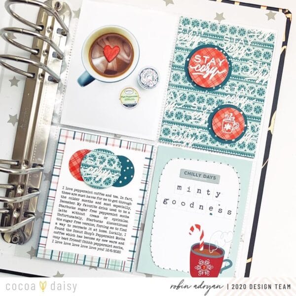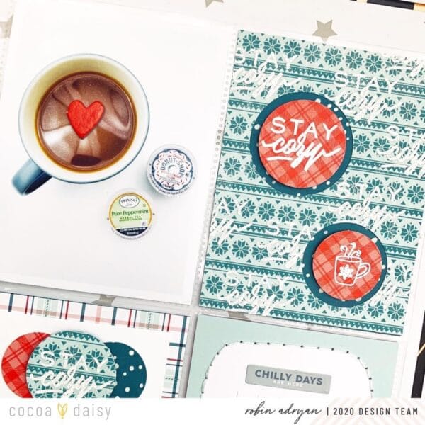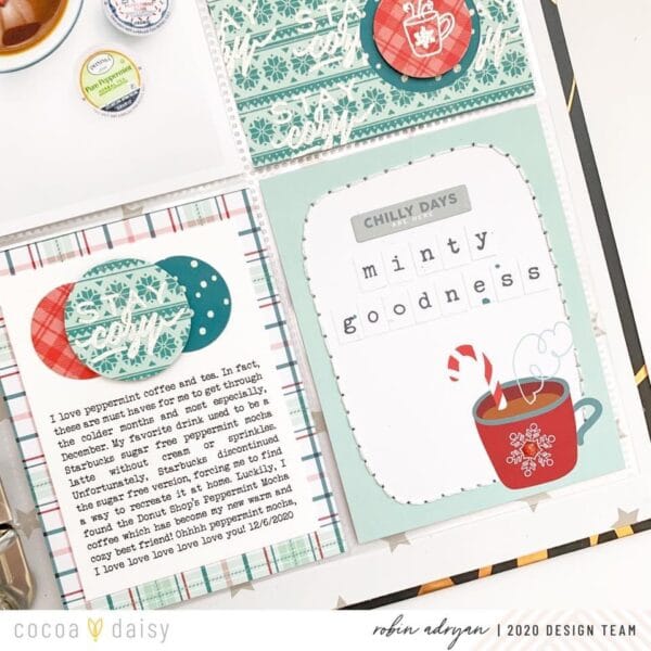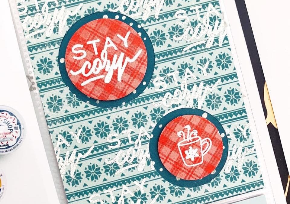 “For December I wanted to document my favorite hot drinks with a textured layout. I decided to create a heat embossed background with kit papers and stamps. I don’t emboss often but December is a special month in our family and I like to add more sparkle and shine to my December memory keeping.
