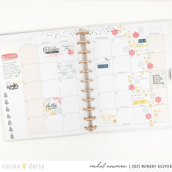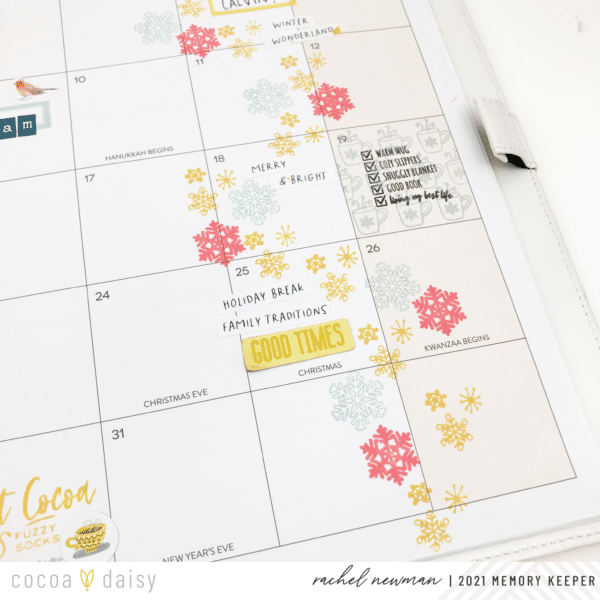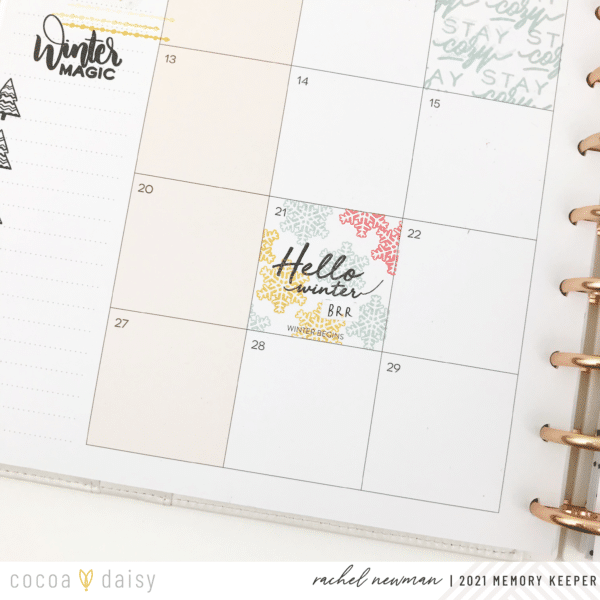 The falling snowflake is a great example of a happy accident. I accidently transferred ink to the page when I made the washi mask for the stamped images on the Saturday box. It was noticeable and hard to cover up, so I decided to go with it! I used several of the snowflakes from both stamp sets and started stamping away! I don’t mind having large, stamped designs on memory planner pages because you can always write over the stamped image if you need to. In the end, I really like how it turned out!