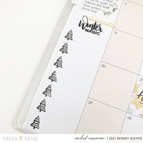 For my weekly spreads, I like to use stamps to create my own decorative boxes and journaling spots. The scale of these stamps makes it easy to create little designs or use the icons as bullet points. I repeated the tree bullet point idea on my monthly page as well. Using the “Winter Magic” stamp as my title, I can list the highlights of the month in the sidebar. Make sure to check out my YouTube Channel for a stamping process video.