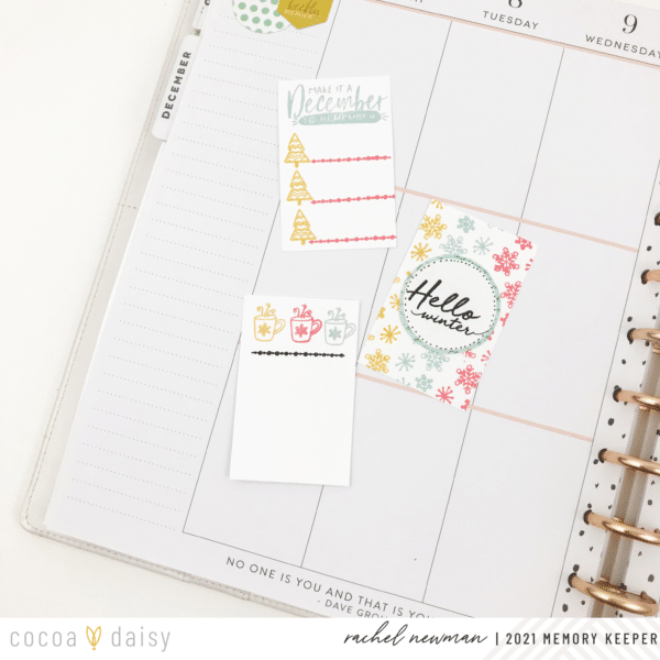 In today’s post, we are focusing our attention on the adorable, and versatile, stamp sets from the Cranberry Rose Collection.If you subscribe to the Memory Keeping: Pocket Kit or the Travelers Notebook Memory Keeping Kit, you receive one of these exclusive stamp sets every month. The stamps are always something we look forward to and can be utilized again and again. This month’s stamp sets (which can also be purchased separately ) include snowflakes, mugs, trees, and several snuggly sentiments to capture this holiday season. We have two designs for you that show different ways to use the stamps in your memory keeping and planner spreads.