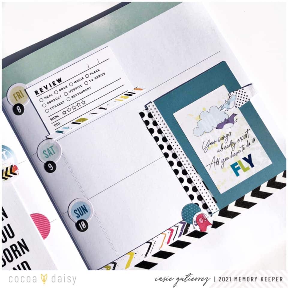 And to bring this memory planner spread together, I have to brag about the Modern Memory Keeping Kit briefly. The variety of this kit lends itself to documenting your story in a variety of formats. I am not using pocket page protectors and yet I love their sayings as a jumping-off point for telling a story.  In my layout, I created a tip-in for one journaling card that I wanted to keep private.  I also layered on a pocket card on top of pattern paper because I loved the quote on it.