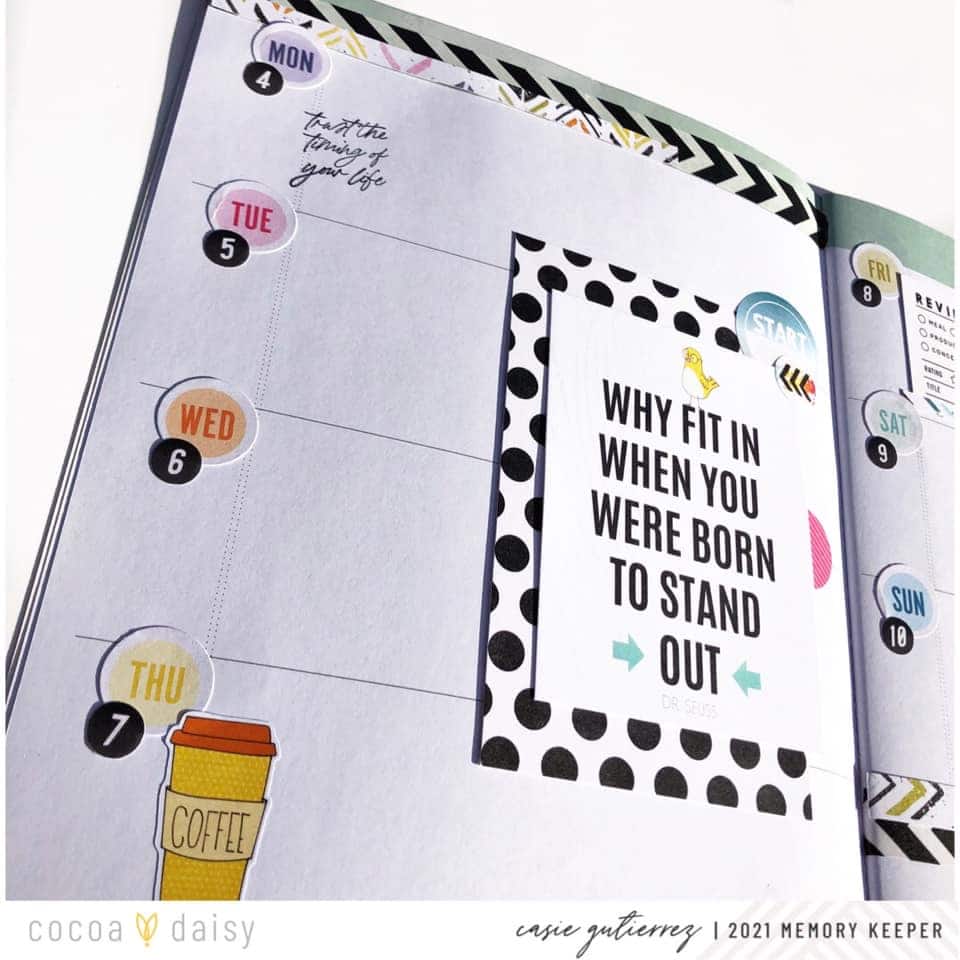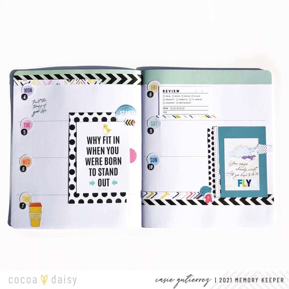 There are so many other items in the Modern Memory Keeping Kit that I plan to play with in future memory planning layouts.  Stay tuned for those!”  Pocket cards are not just for pocket pages! We love how Casie incorporated the pocket cards in her memory planner spread. Notice how Casie is showing a “before the pen” spread here. Since memory planners are usually waiting for the weekly moments to actually happen, Casie’s trick to pre-decorate is a great one! This allows her to fill in the details as the weeks progresses. You could even pre-decorate the whole month if you wanted to!