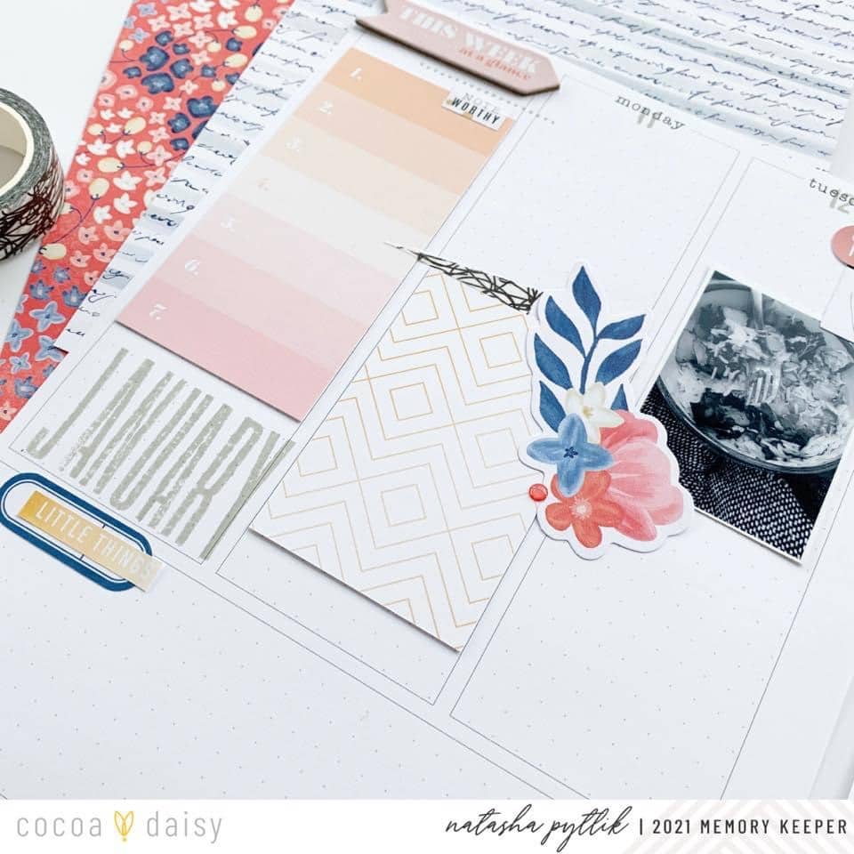 “I have been memory planning for years, and like many of my fellow Creative Team Members it is my favorite form of Memory Keeping. I am so excited to be using the new Daisy Planner in the vertical layout as this year’s memory planner. The neutral pages and limited structure lend itself perfectly to any type of Memory Keeper. For this week, I had more events Monday through Friday, so I decided to primarily highlight those days in the spread. I will then document the smaller weekend moments in the bottom left box that I renamed “little things” with a sticker from the Denim and Blush Sticker Kit.