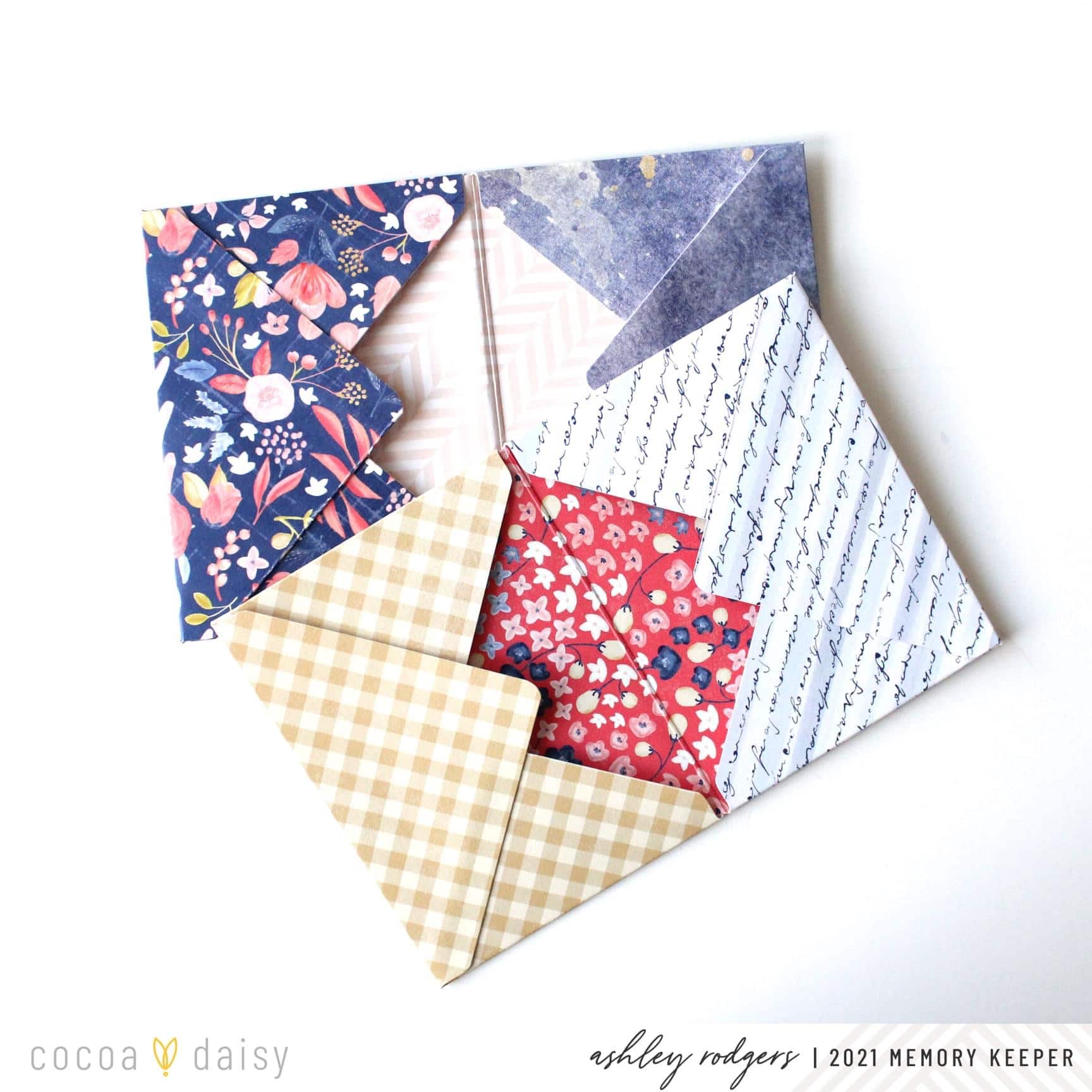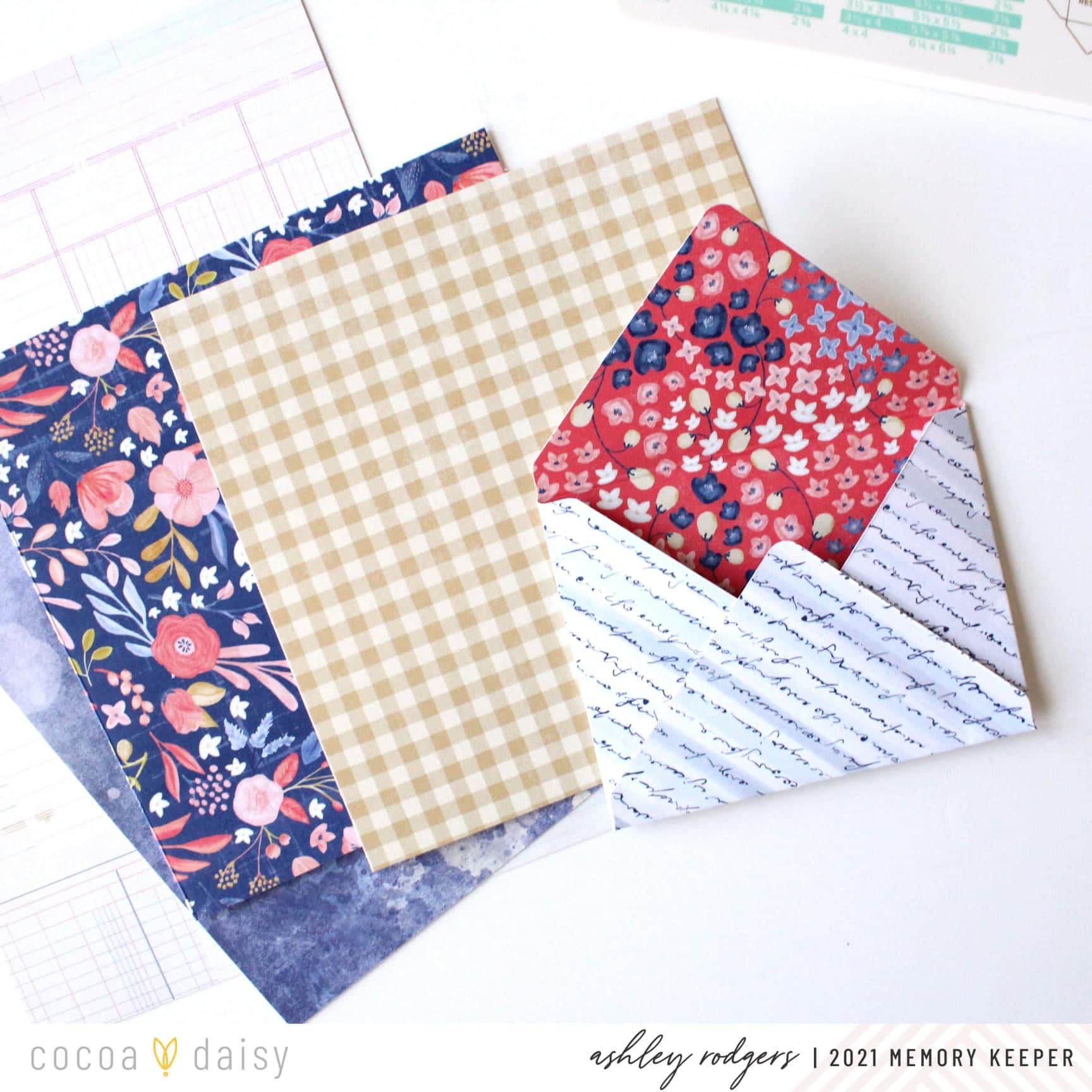 First, I chose four patterned papers and used my We R Memory Keepers envelope punch board to make four 3×4 envelopes.