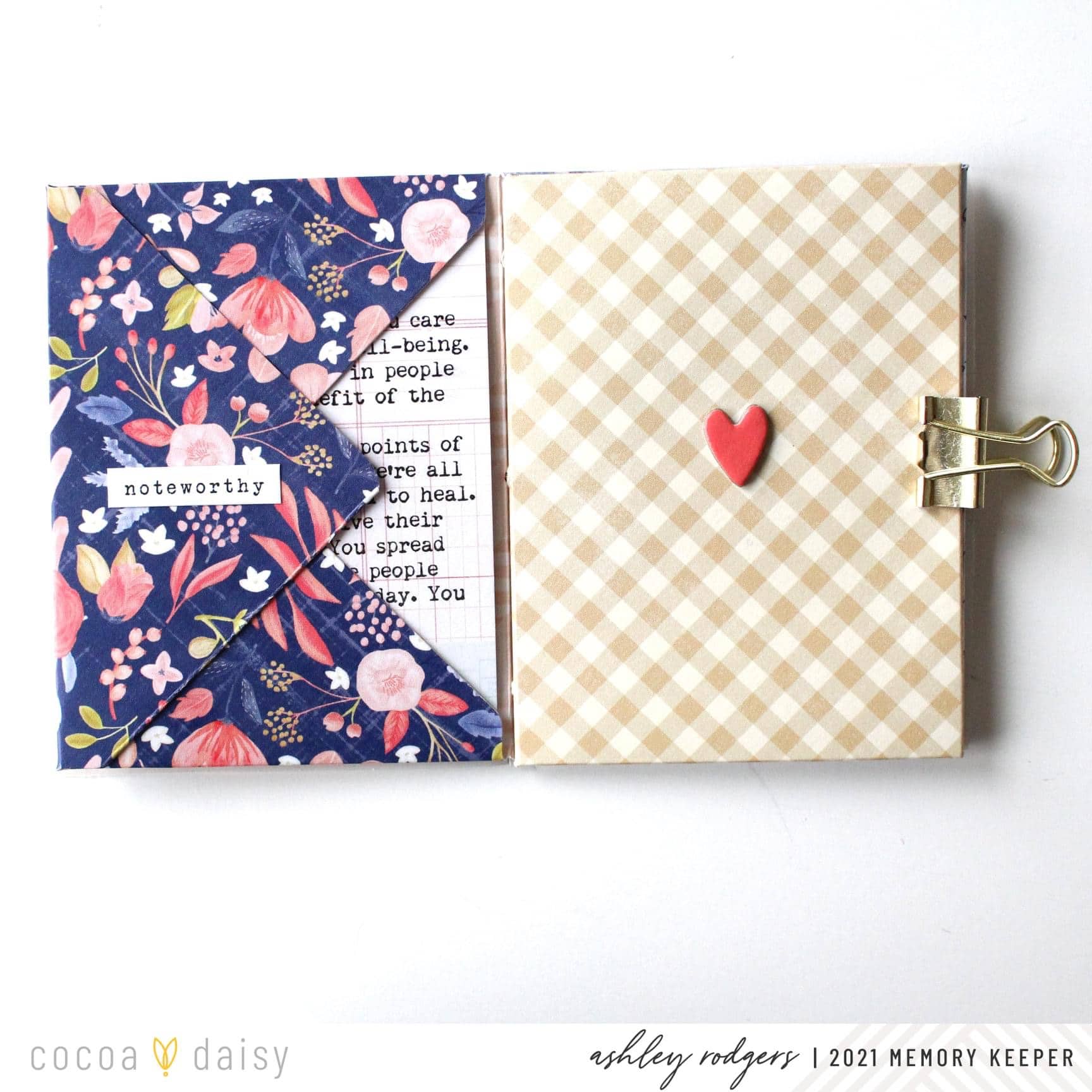 Then, I cut the 6×8 ledger patterned paper into four 3×4 cards for my journaling. The cards easily tuck inside each envelope pocket. During February, we often focus on expressing our love and appreciation for others, but it’s also important to pause and show ourselves some love too. I hope you enjoy this little self-love project and have fun creating!” This envelope journal is adorable and a great way to use the papers and embellishments that come in the Denim and Blush Modern Memory Keeping Kit.