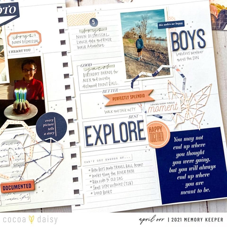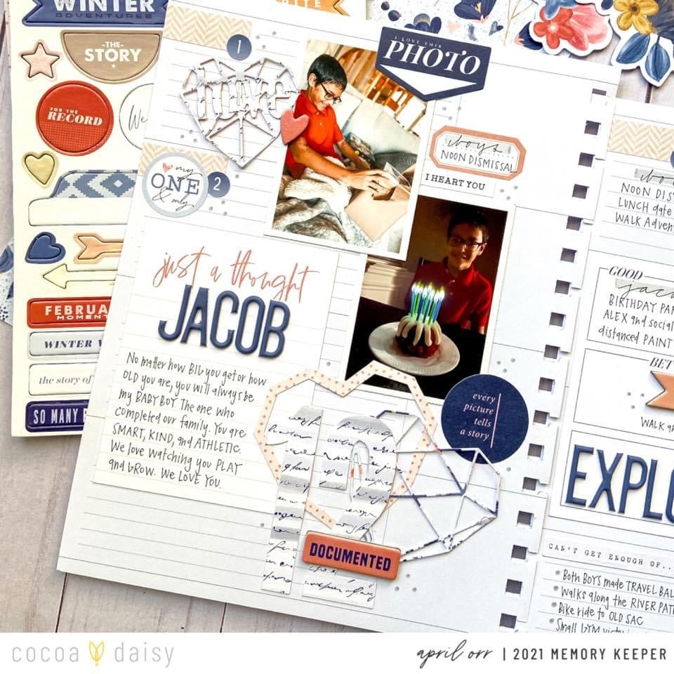 The cardstock can be a great foundation for your memory keeping pages, but it can also be cut, punched, ripped, and sewn to make beautiful die-cuts as April has shown here. We love how April used the pocket cards to prompt her journaling, too!