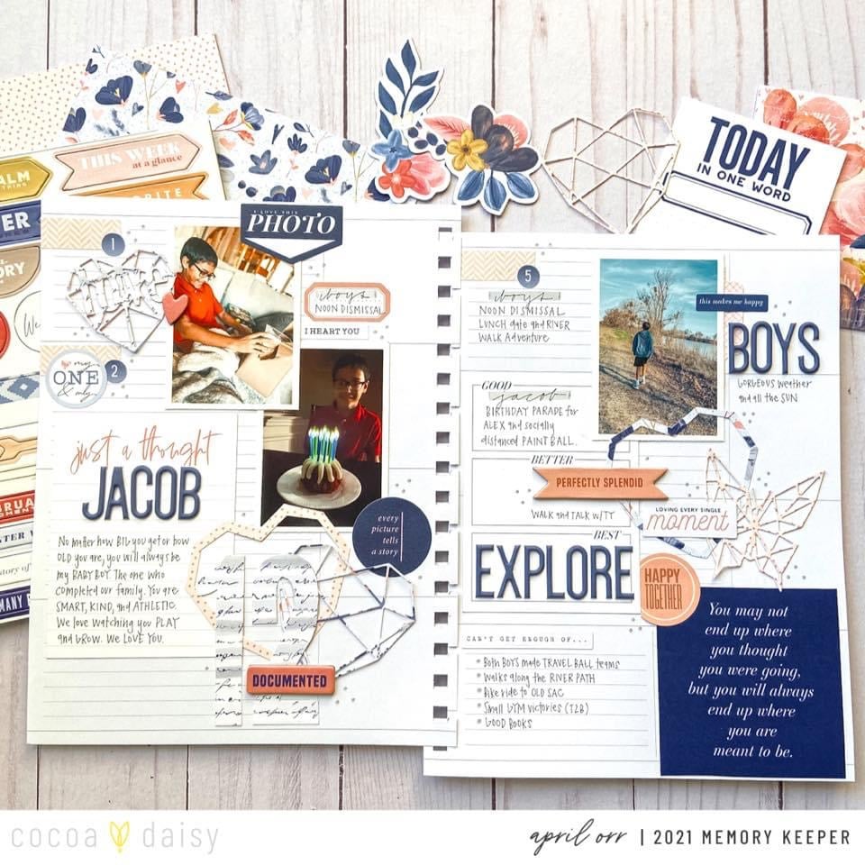 To finish the spread, I added a couple of photos, pocket cards, alpha stickers, and die-cuts from the Denim and Blush Modern Memory Keeping Kit.”