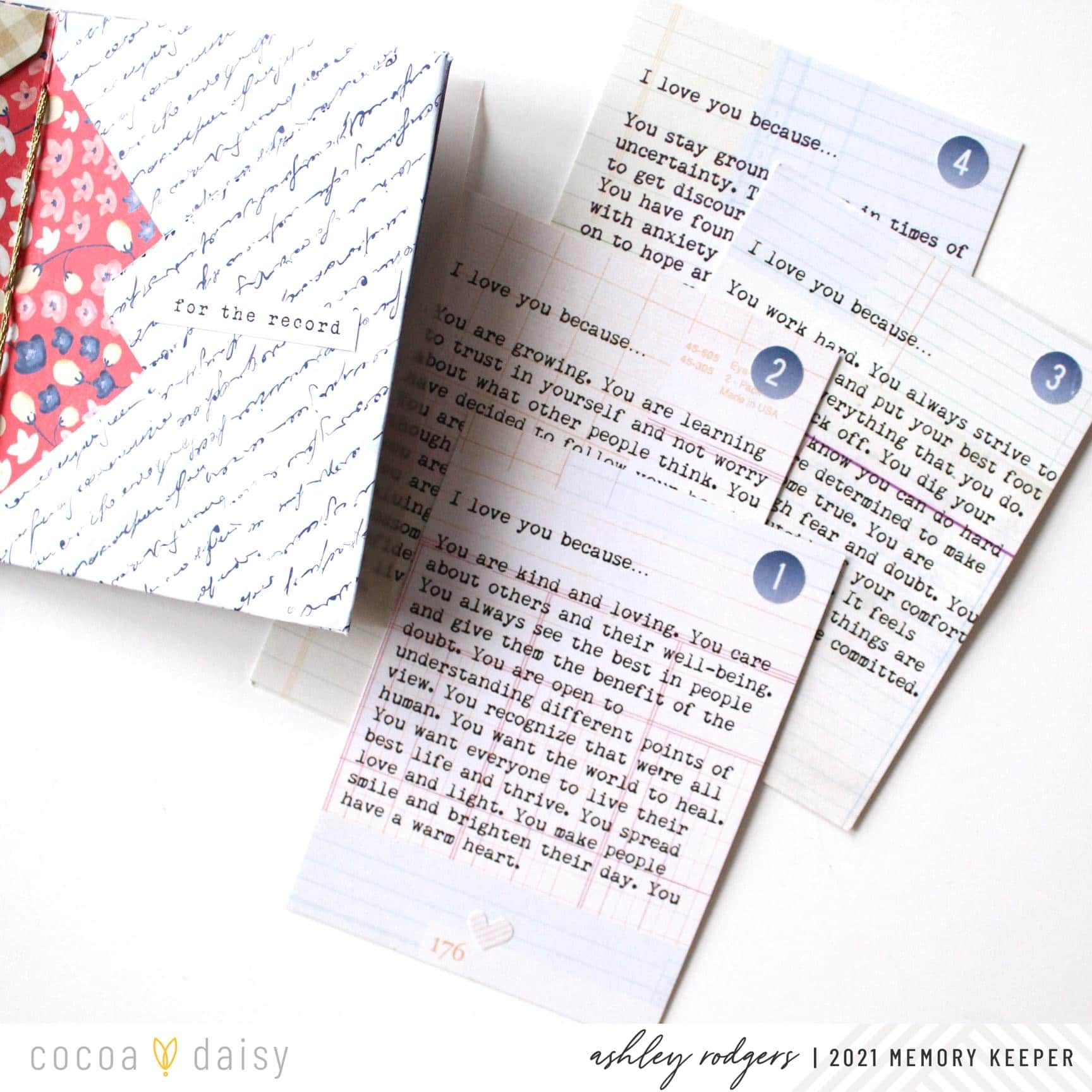 “Hello! I love the addition of the word phrase stickers to the Denim and Blush Modern Memory Keeping Kit this month. They make great journaling prompts, and I was inspired to create a mini envelope journal with four love letters to myself.
