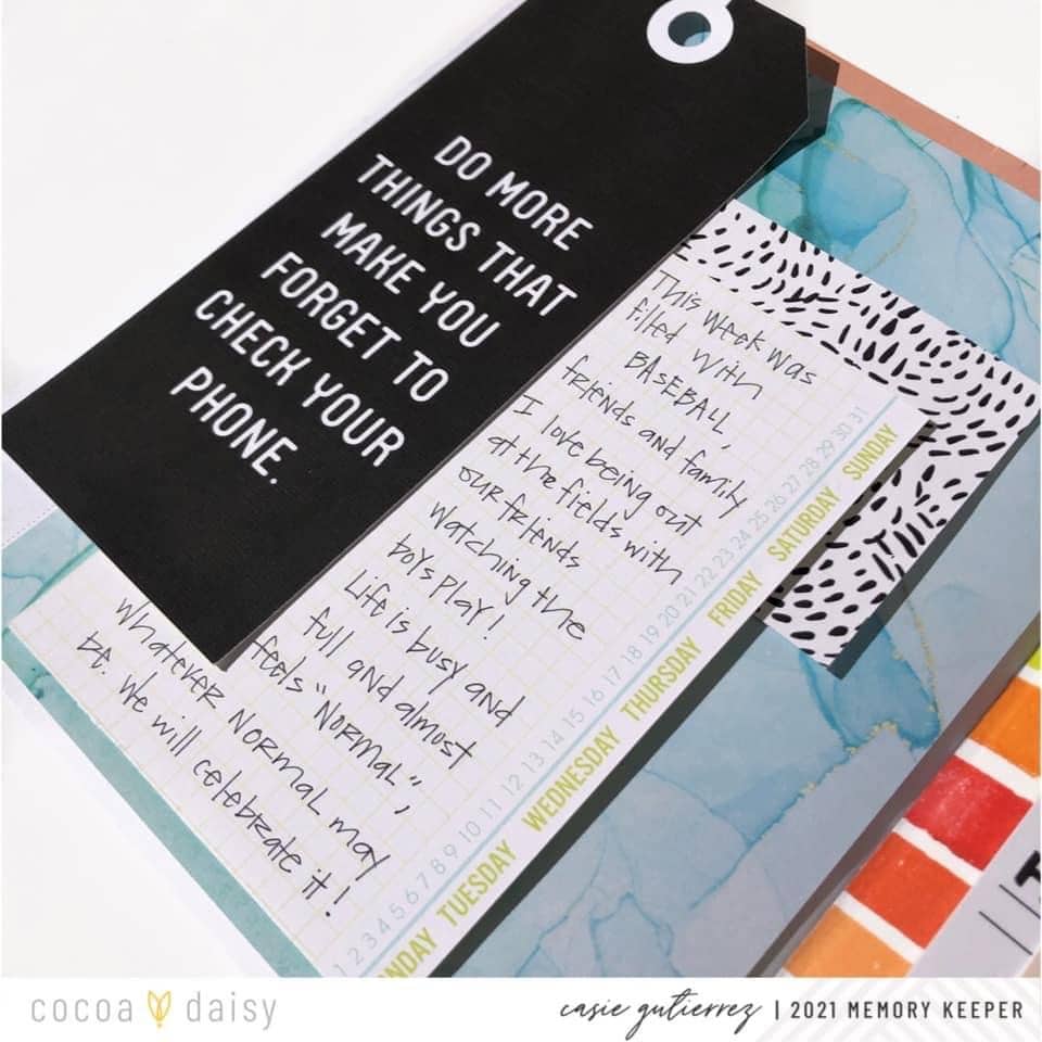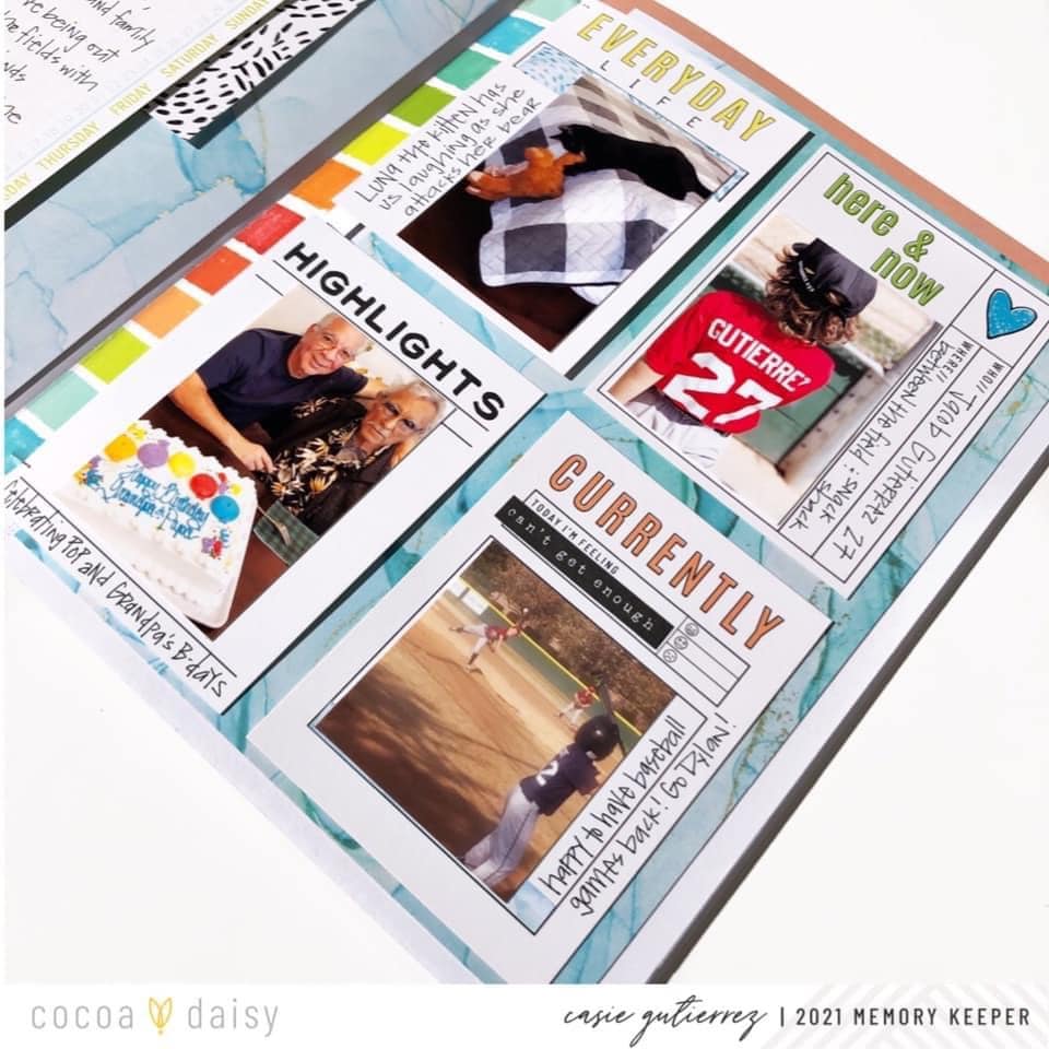 I finished the left side off with a 4×6 journal card turned vertically. I hope you enjoy this layout format as I had a blast creating it!” The great thing about memory planning is that there are no rules, and if you want to completely cover the weekly template, you can! We love how Casie incorporated the large tag and pocket cards to document her week. Typically, there is less page “real estate” in a memory planner as compared to pocket page spreads so sizing the photos for the journaling sections of the pocket cards is a great way to efficiently utilize the memory planner page.