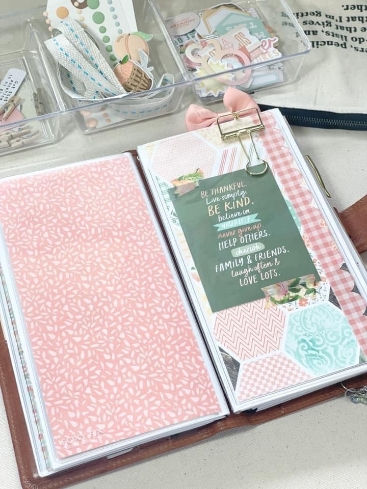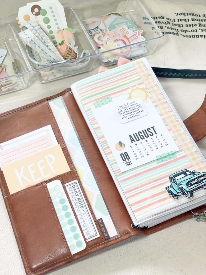 I set up my standard size traveler’s notebook this month with 5 different dashboards. I use the paper and different kit elements and slide the decorated pages into plastic dashboards for a quick and easy transition from month to month For the first dashboard, I took the striped paper from the Peach Ridge Planner Kit and added the calendar project card from the Peach Ridge Modern Memory Keeping Kit with some washi. I also layered a sun die cut and a quote card from the Peach Ridge Travelers Notebook Memory Keeping Kit. I finished this particular dashboard off with the truck adhesive from the Peach Ridge Planner Add On Kit and I love opening my planner to this sight!