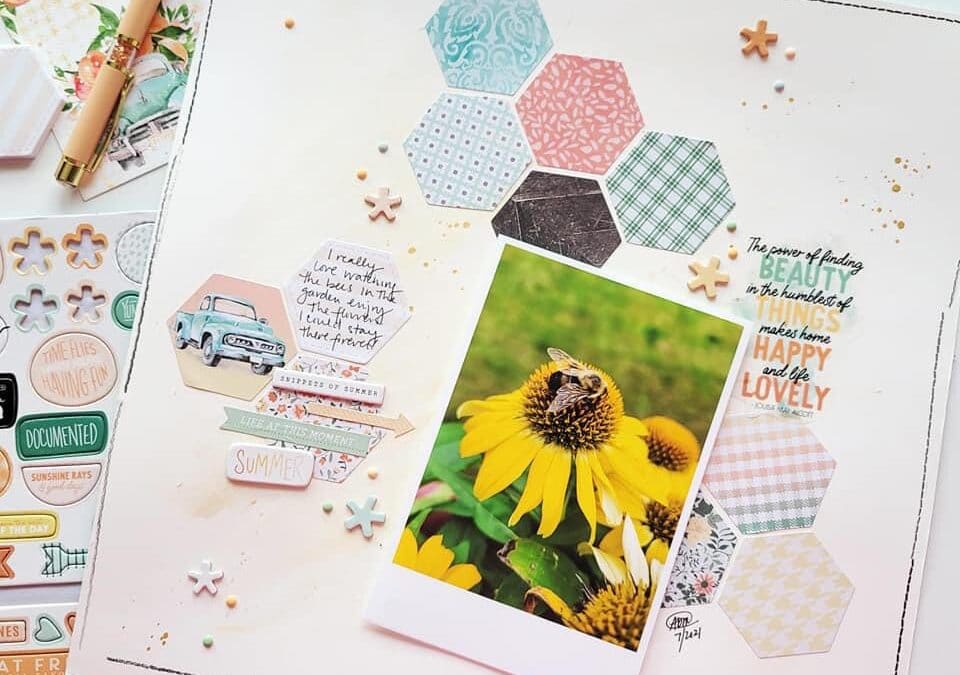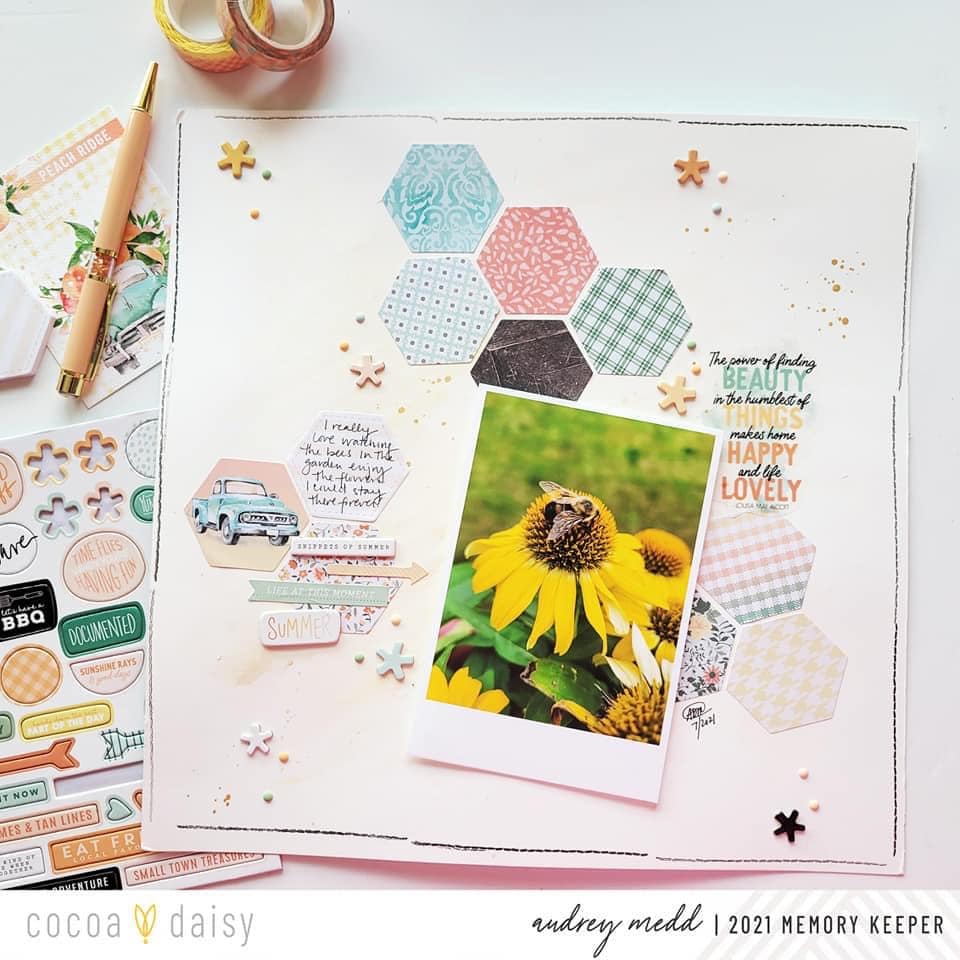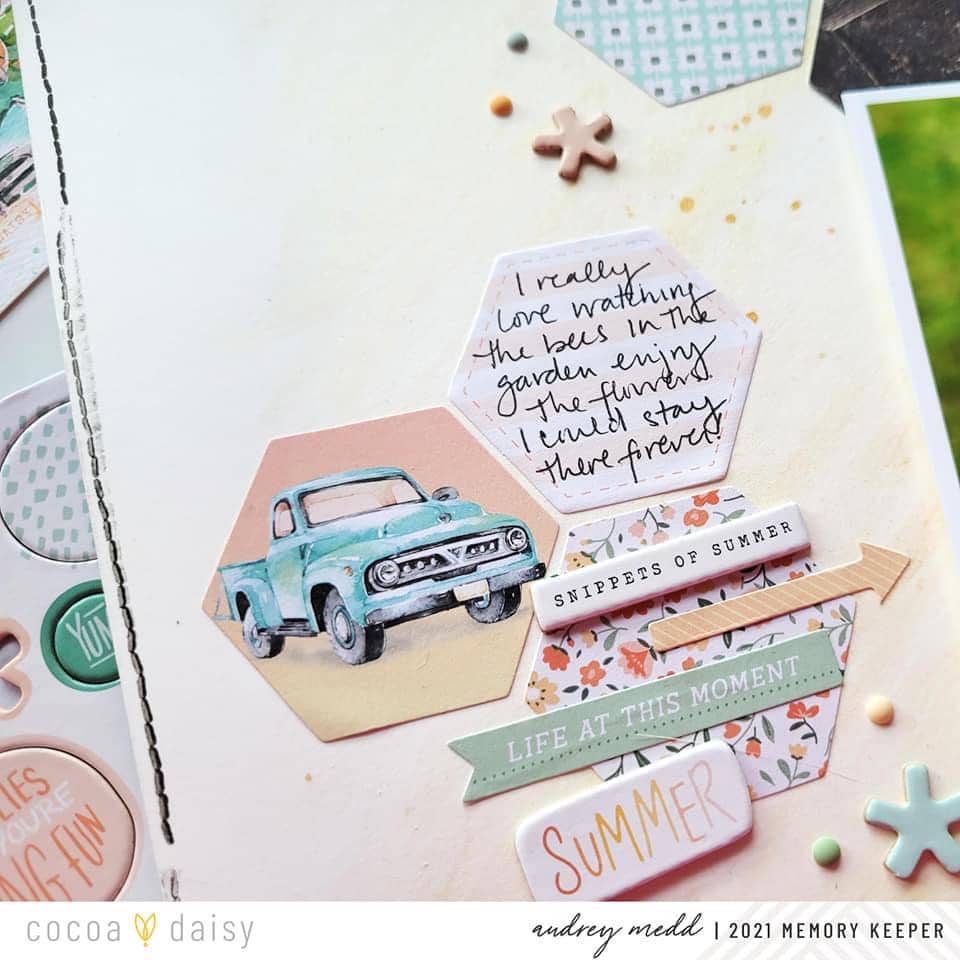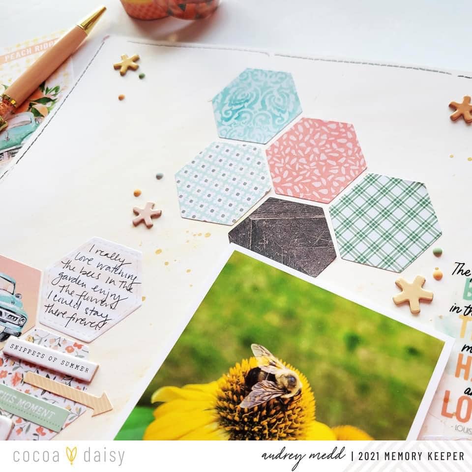 I started this layout by creating a mixed media background with two different yellow paints from my stash. I then scattered the hexagon die cuts from the Peach Ridge Collection down the page using colors that coordinated with my photo. I couldn’t resist that cute peach truck hexagon and added that.