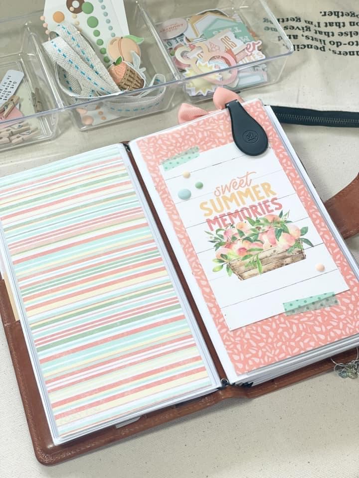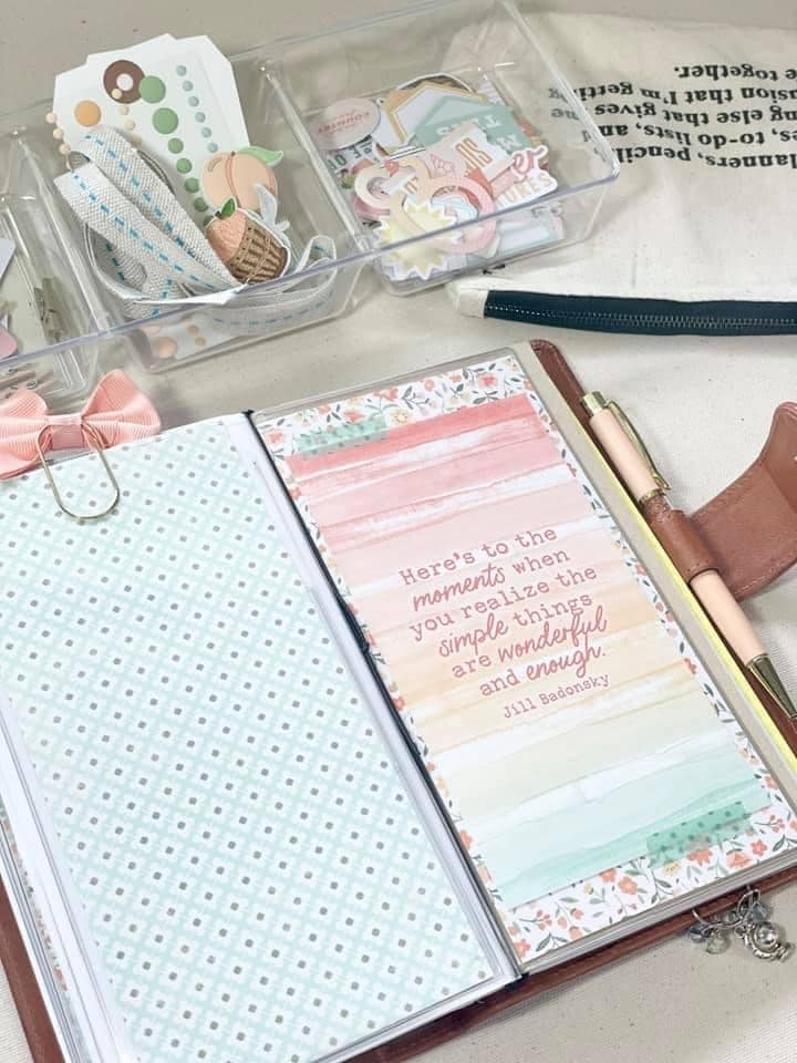 The second dashboard was quick and easy, too. I took the peachy printed paper from the Peach Ridge Planner Kit and added a personal size dashboard from the Peach Ridge Dashboard Kit with some washi. I finished off the look with some enamel dots. Did you notice the matte finish on the enamel dots this month rather than the usual glitter finish?! It sure does remind me of peach skin. This month, the enamel dots came in the Peach Ridge Travelers Notebook Memory Keeping Kit.