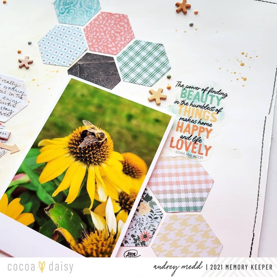 I finished by adding some journaling in the hexagon using my absolute favorite — the pen that you get in the Peach Ridge Planner Kit each month. Fun tip, the hexagon journaling is a sticky note pad found in the Peach Ridge Modern Memory Keeping Kit. I used it for my journaling. Cheers friends!!