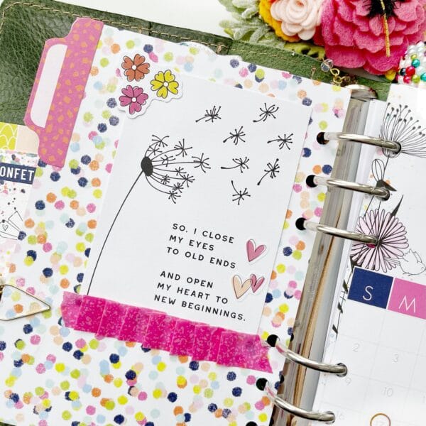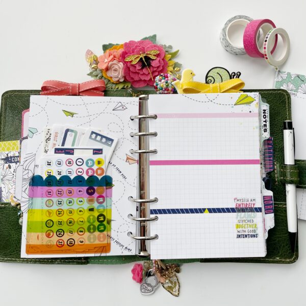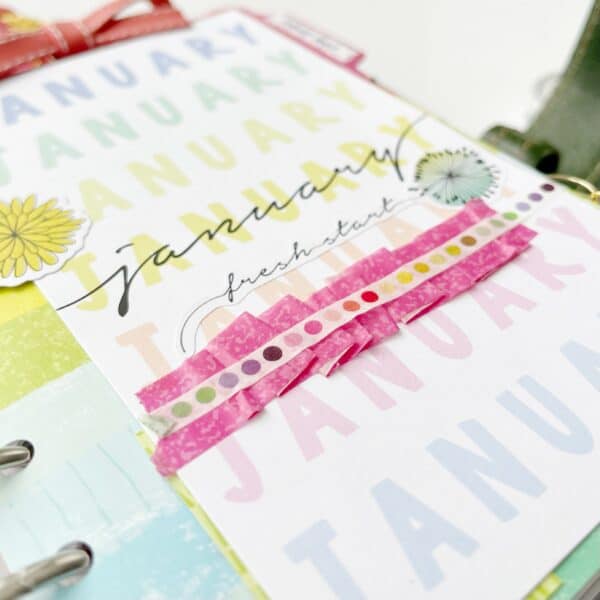 We cannot wait to share Cheryl’s b6 ring bound setup with you, so let’s dive right in! We HAVE to share one of Cheryl’s signature moves – the washi ruffle! Here, Cheryl used the pink washi as a ruffle on a personal size dashboard and layered it with the thin polka dot washi.