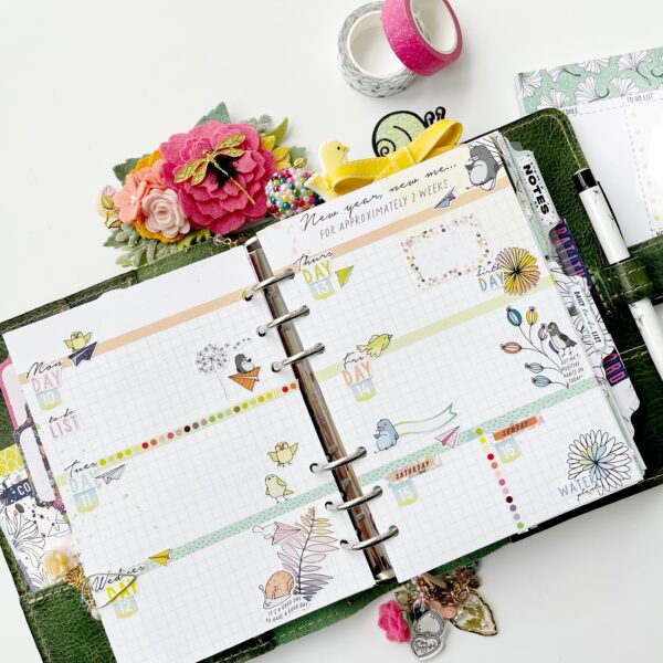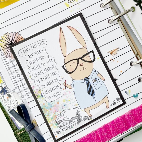 Are you familiar with Simon, our mascot? He makes his appearance in our Planner Classified Kit each month. He’s particularly snarky this month as he sets his New Year’s Resolutions…