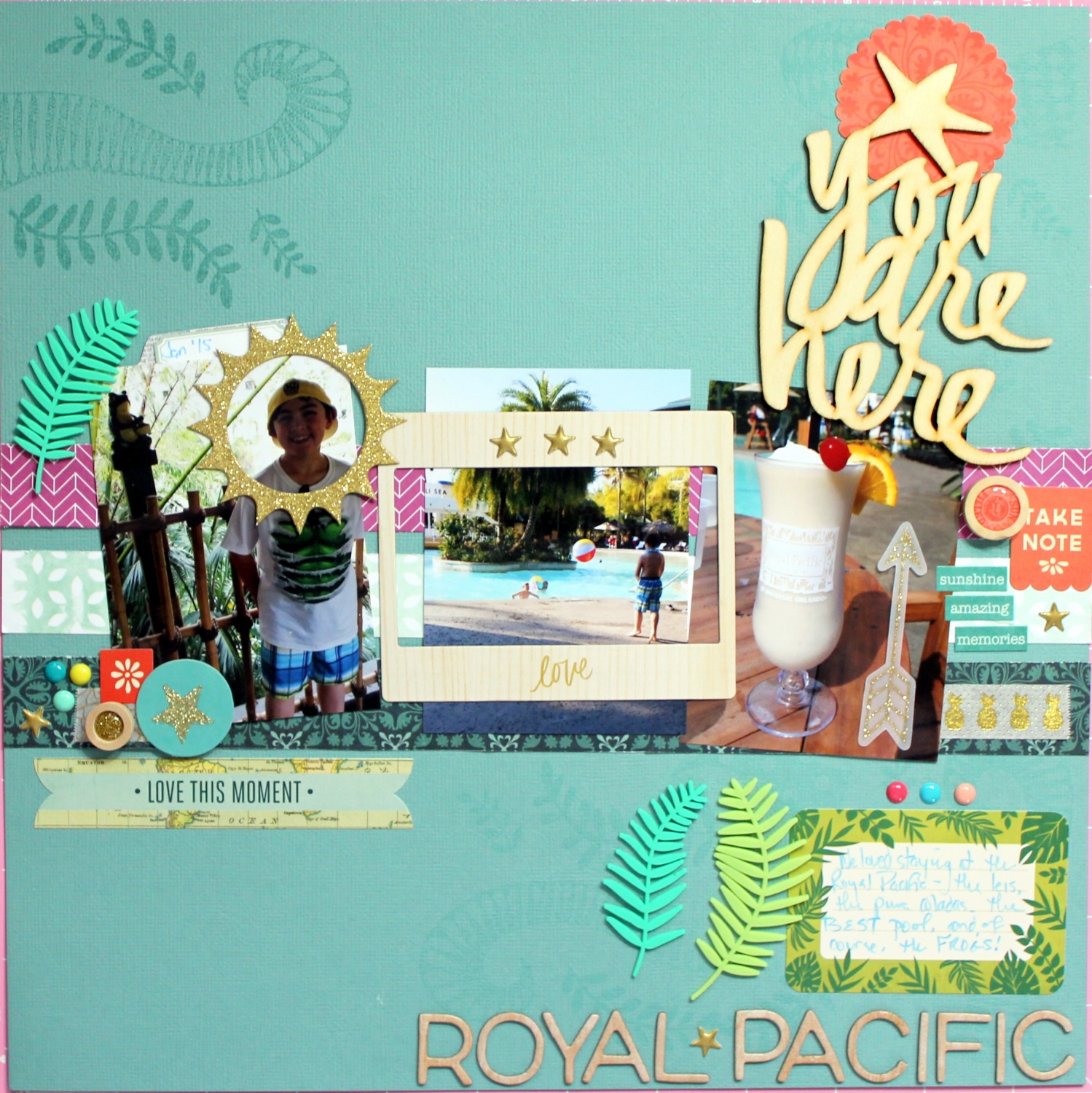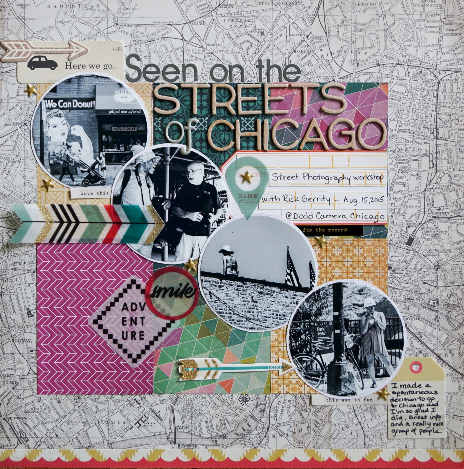 Last up is this awesome layout by Carolyn. I love the design which is clean and simple and yet Carolyn added just the right touch of embellishments and the stamping to give it the perfect touch of eclectic fun.