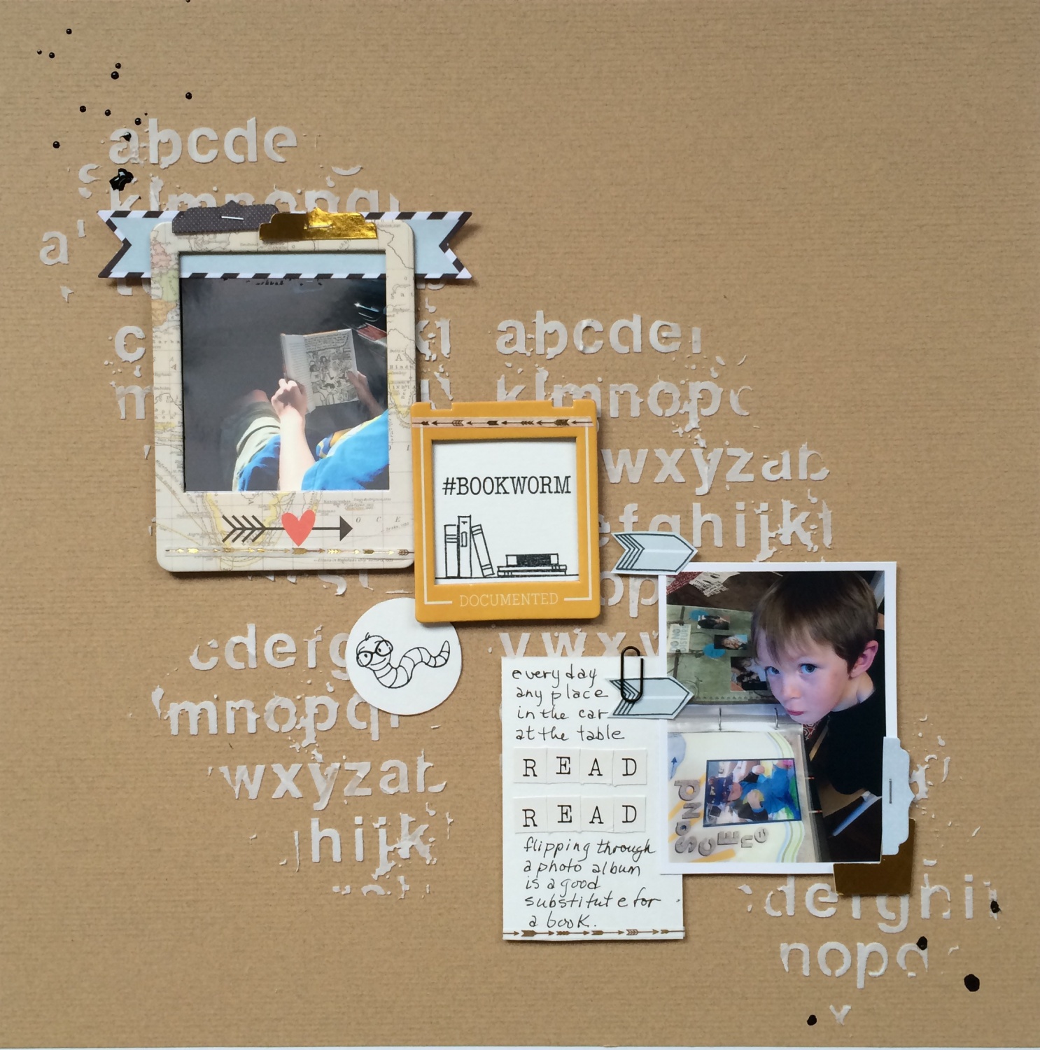 I really like how Shannon used an alphabet stencil and some modeling paste for this striking background. It is textured and interesting but does not distract from her subtle photos.