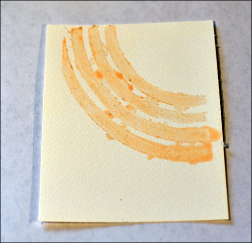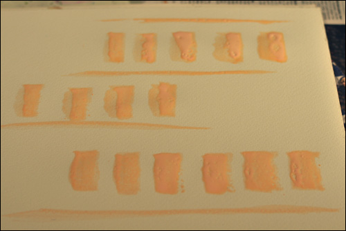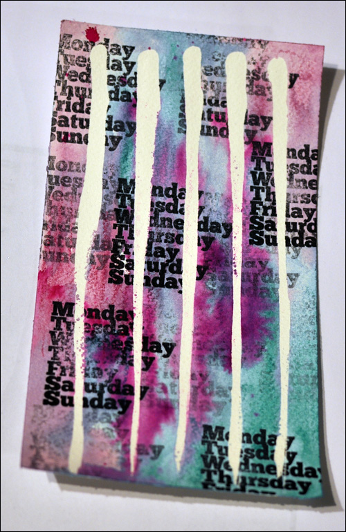 I also tried using acrylic paint with the masking medium and it works perfectly if you apply a thin wash of paint. When the paint gets too thick, I had some problem though, as the page was torn when I tried rubbing the masking medium away. In this example below I varied how much paint I applied, and it all worked just fine. It wasn’t until the paint got even thicker that I had problems.