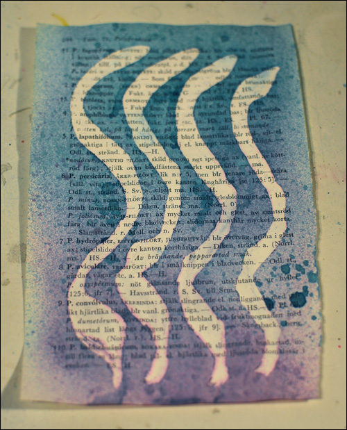 I was impressed to see that it was possible to use the masking fluid on the quite fragile book page too, without tearing the page. Here I used mist to colour the page.