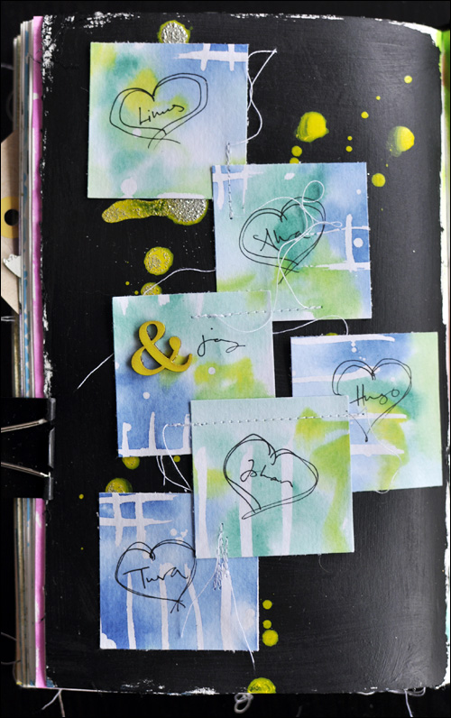 I painted a page in my journal using black gesso and then splattered some yellow acrylic ink on top. Before the ink was dry I added some silver glitter embossing powder. I then added my stitched squares to the page and wrote the names of everyone in my family in little hearts. I used yellow watercolour for the ampersand.