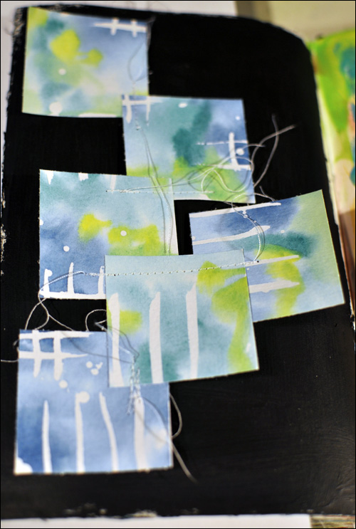 After rubbing the masking medium away, I cut the paper into squares and I used my sewing machine to stitch them together.