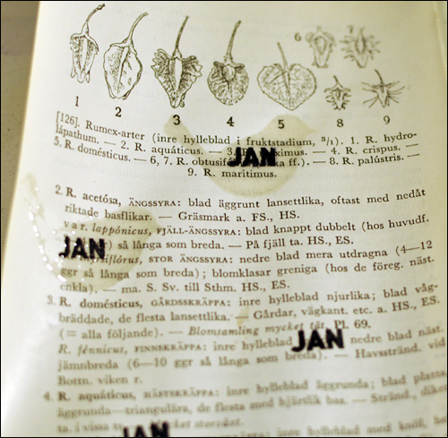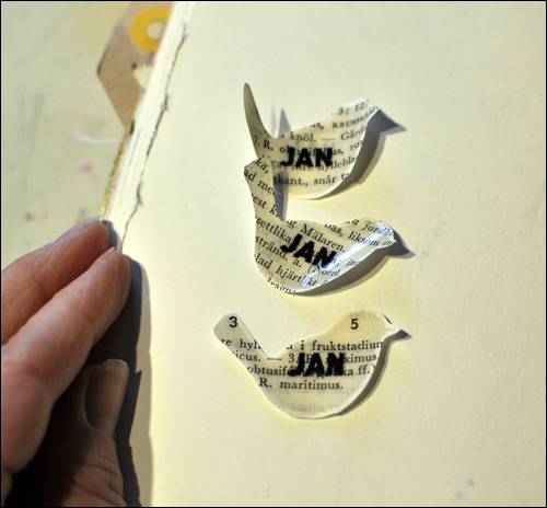 I made some cute elements to decorate my page, by stamping “JAN” on a book page, using the stamp from the January Day in the Life kit. I then used the bird stamp on top of the previously stamped word, together with a versamark pad and clear embossing powder.