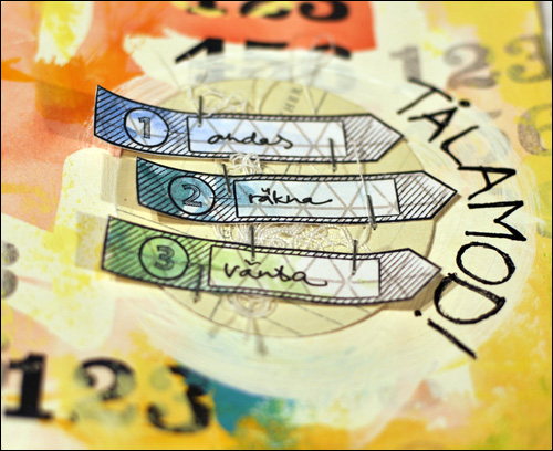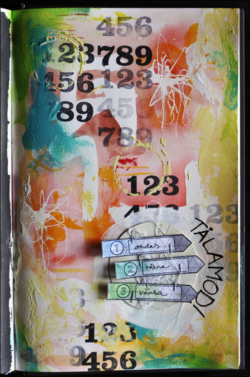 I added a circle of patterned paper, painted around the circle, used the 1-2-3-stamps from the main January kit, painted the stamped images and stampled them to the patterned paper. I also added some messy thread. The words say 1. breathe, 2. count, 3. wait and outside the circle I wrote “patience”.