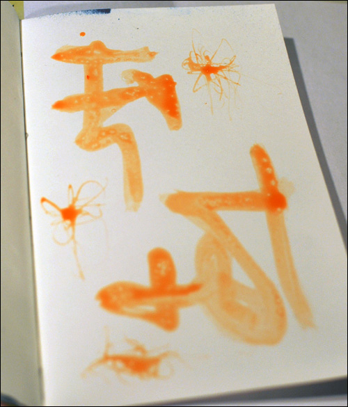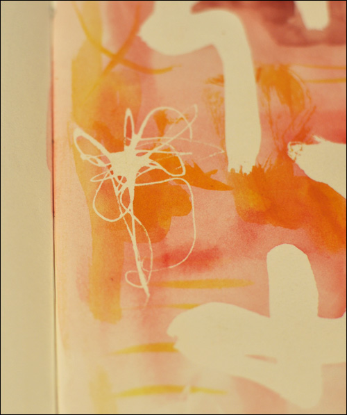 For my next page, I started out directly onto my journal page, making some very random marks with the masking fluid. I used the bamboo skewes to drag the medium out into thin lines.