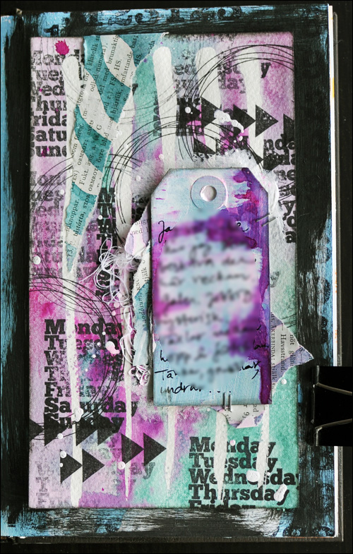To finish my page, I added some more stamping (triangles and circles) and white paint splatters (using acrylic ink). I also glued down some torn pieces from the book page I showed you above and I added some messy thread. I wrote my journaling on one of the tags from the main kit.