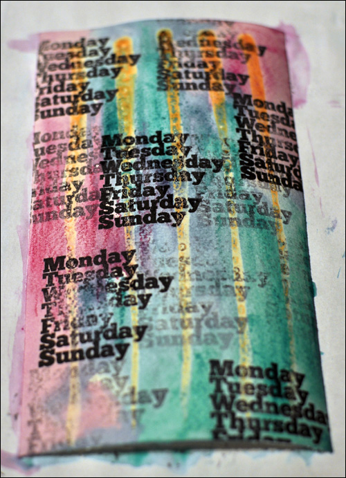 My next page turned out really, really busy. I started out with stamping on top of a set of parallel lines of masking fluid. I then added colour using the Inktense Pencils (from the June Project Art kit).