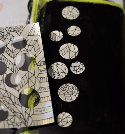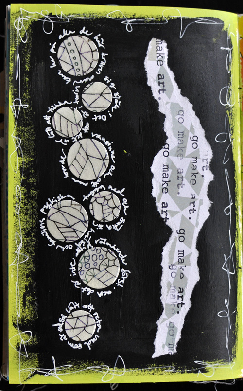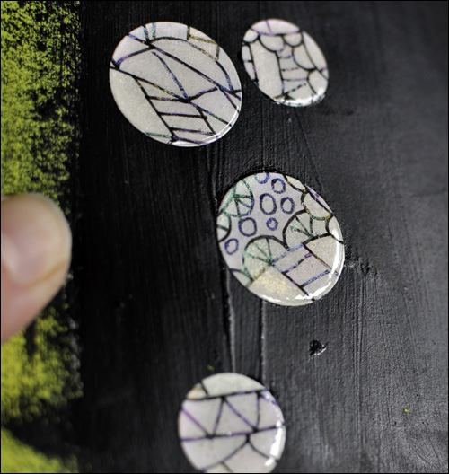 I then used my Cuttlebug to die cut some circles out of the doodled paper. I added them to a page painted with green acrylic paint at the edges and black gesso in the middle.