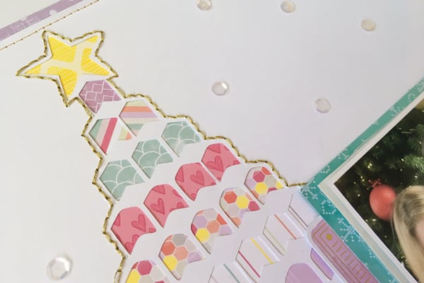 As I filled in the tree, I used two strips of the square to cover a longer row. I just made sure that the strip ended in between the openings so that you wouldn’t be able to tell that it is not one continuous strip of paper. This is easier if you use a pattern that is spaced out like the diamonds, or use a solid. For the longer rows I used strips of 12×12 paper and branding strips from the papers in the kit.