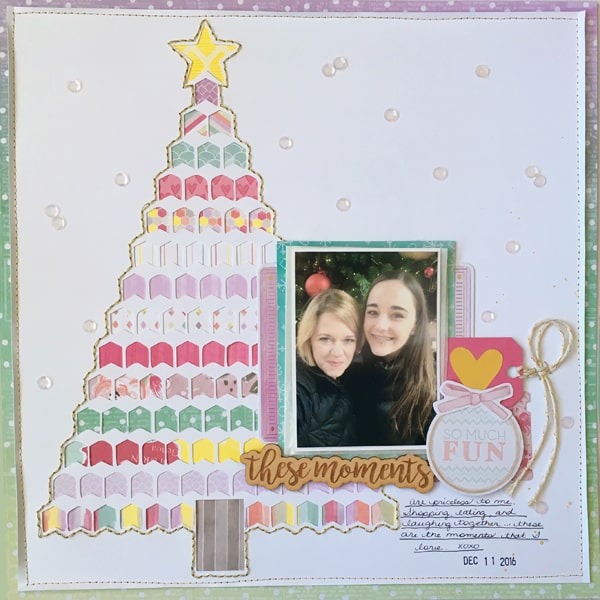 Since some of the papers and embellishments used were designed by Paige Evans, it was only fitting that I included hand stitching on my layout. I did handstitch around the tree with gold embroidery floss which helped to contain the tree and really made it the focal point on my page. In my experience, metallic floss tends to break a bit easier so I find that I am a bit more gentle when pulling the thread through the holes. I don’t mind because the end result is worth it to me. If you have any leftover sequins from last month’s kit, pull them into this kit as well because the colors work great with the papers in this kit!