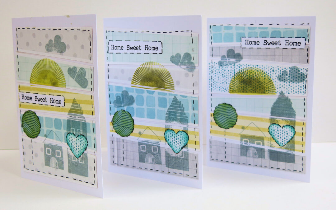 And I used the little houses from the main kit on some new home cards. I found that the yellow ink on it’s own when I stamped the sunshine was just a little too pale and bright and the rays of sunshine couldn’t quite be made out. So I lightly inked it with grey first and then went over with the yellow ink. The stamp appeared much more defined this way.