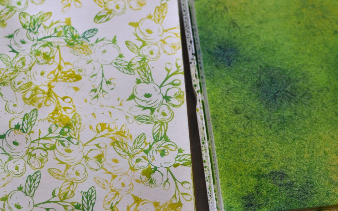 I started out by just playing with the pad, trying out a bunch of the options from Dyan’s video. My favourite of the techniques was using the pad to ink up the cute flower stamp from one of the previous Project Art kits.